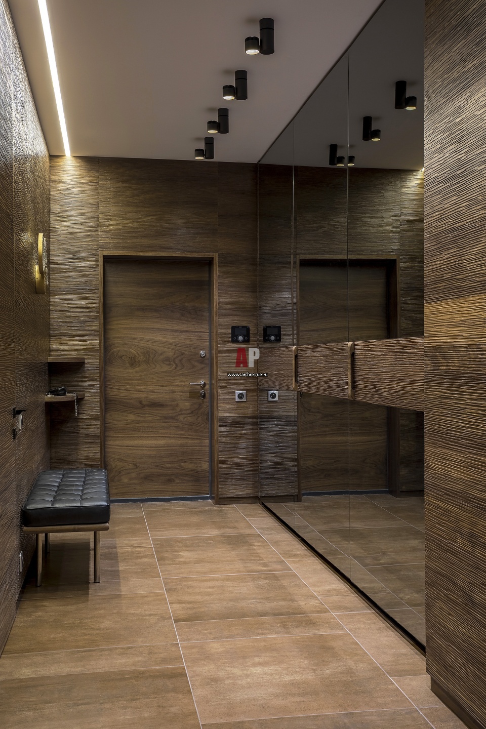 Интерьер входной группы оформлен в эко-стиле. Стеновые панели и фасады встроенных шкафов выполнены из дерева, искусная фрезеровка создает на них горизонтальный рельеф. На полу – ржавый керамогранит крупного формата, Caesar, Palace, поставщик BARS RED.