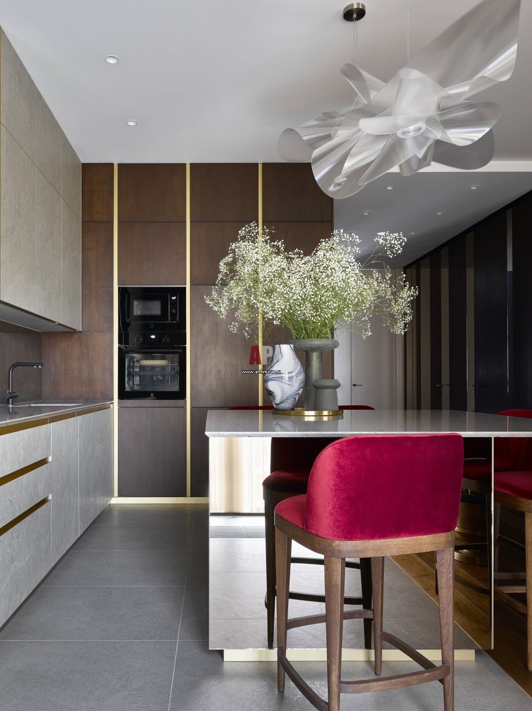 Встроенная техника убрана в колонны, они оформлены шпонированным деревом с латунной раскладкой. Подвесные светильники, Slamp.