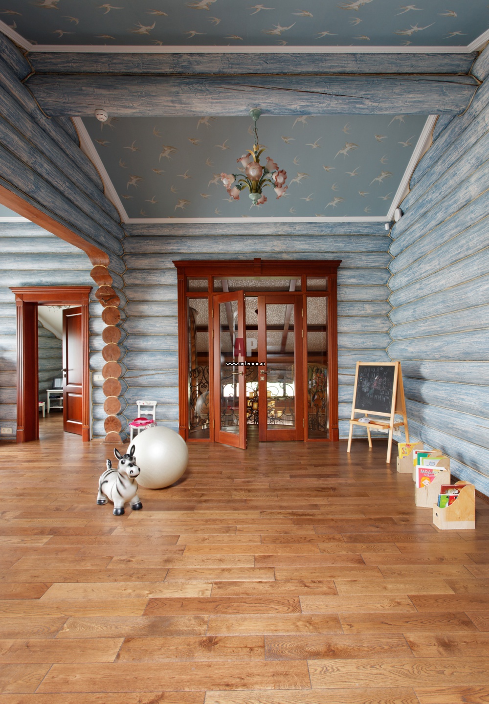 Интерьер детской игровой комнаты в деревянном доме. Стены выкрашены в сложный серо-голубой оттенок. Использовались краски по дереву на скипидарной основе, которые позволили создать эффект патинированного дерева.