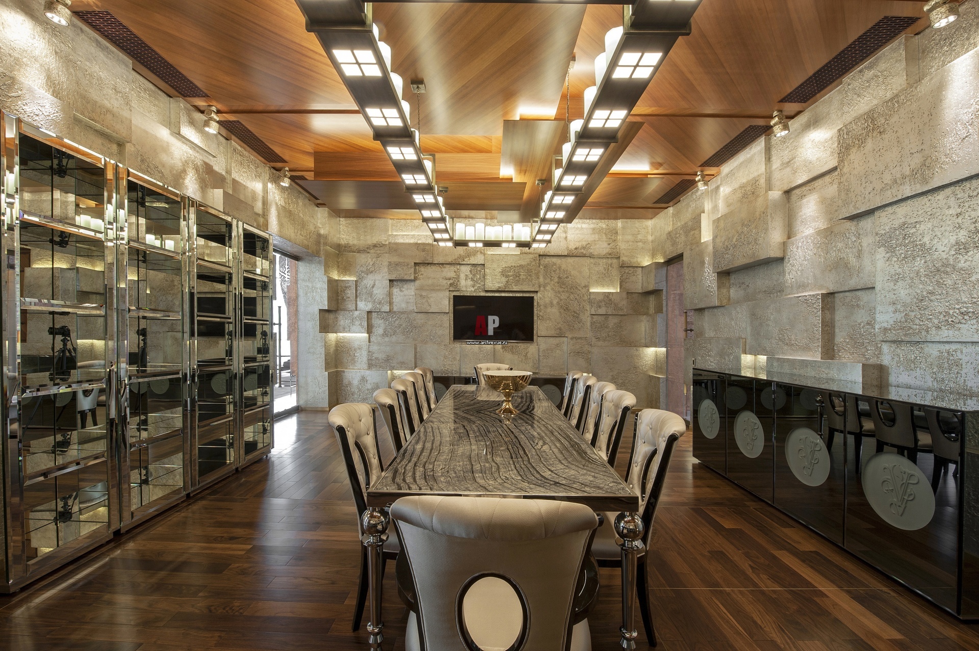 Интерьер обеденной группы. Объемные стены покрыты сусальным серебром. Потолок набран из деревянных панелей, размещенных на разных уровнях. Стол, стулья, комод, витрины, Visionnaire.