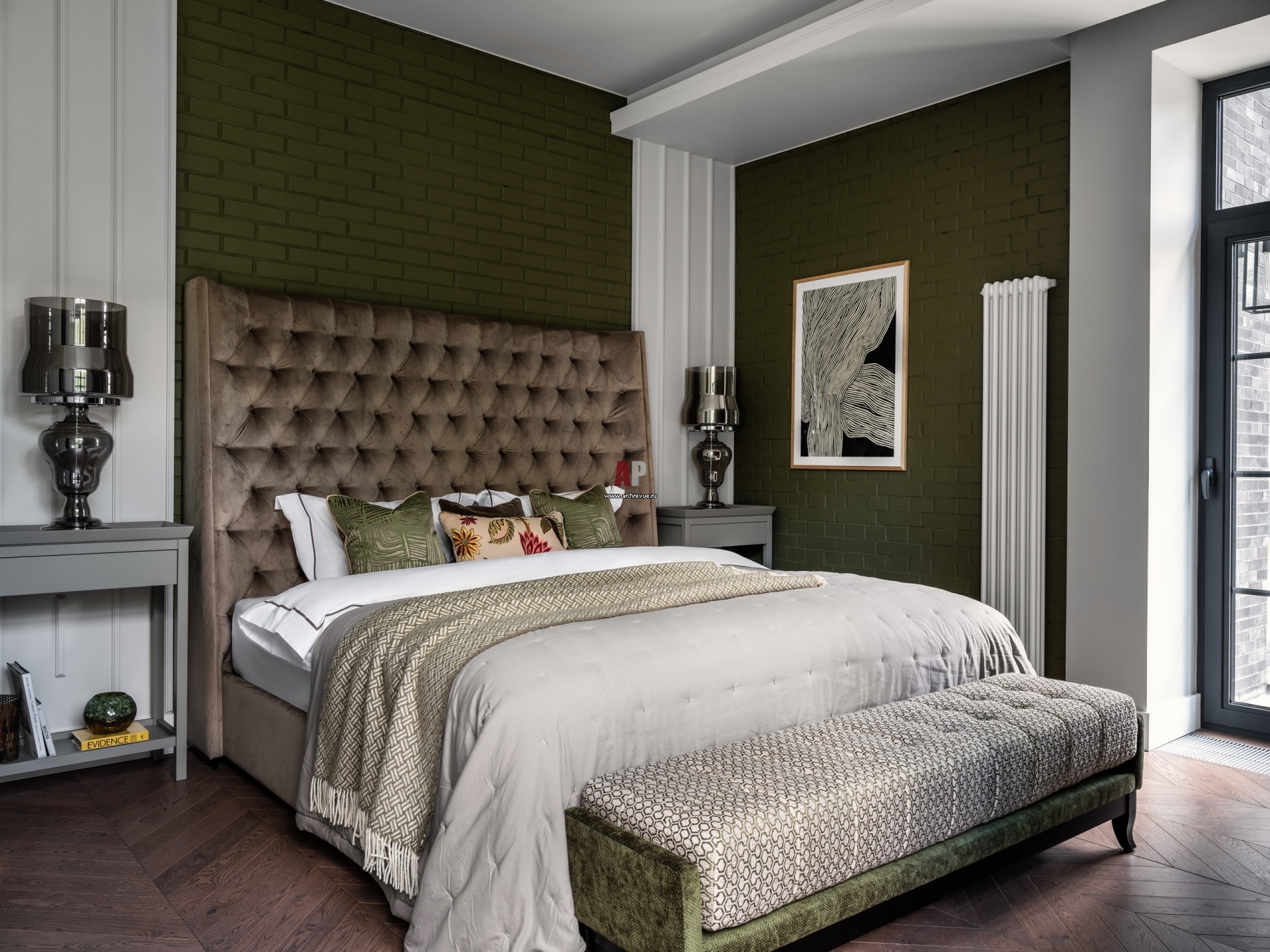Открытая кирпичная кладка в хозяйской спальне выкрашены в болотный цвет. Мебель, Dantone Home, Neptune. Светильники, Visual Comfort & Co.