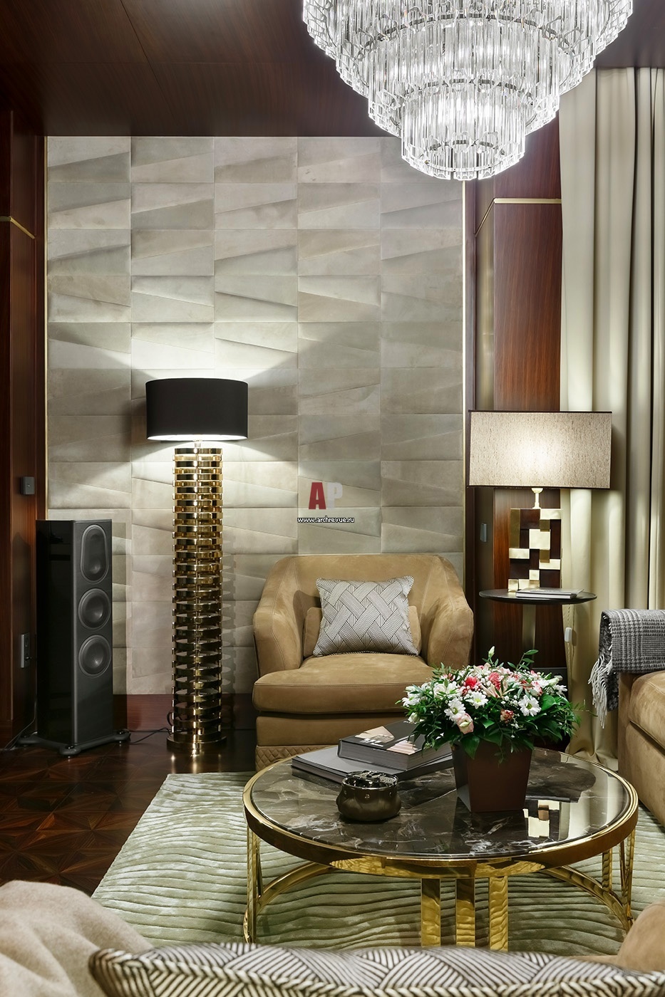 Диванная группа в гостиной обозначена мягкими стеновыми панелями из алькантары. Театральный эффект интерьера усиливает камерная, приглушенная подсветка, тяжелые темные портьеры и светильники с латунной фурнитурой.