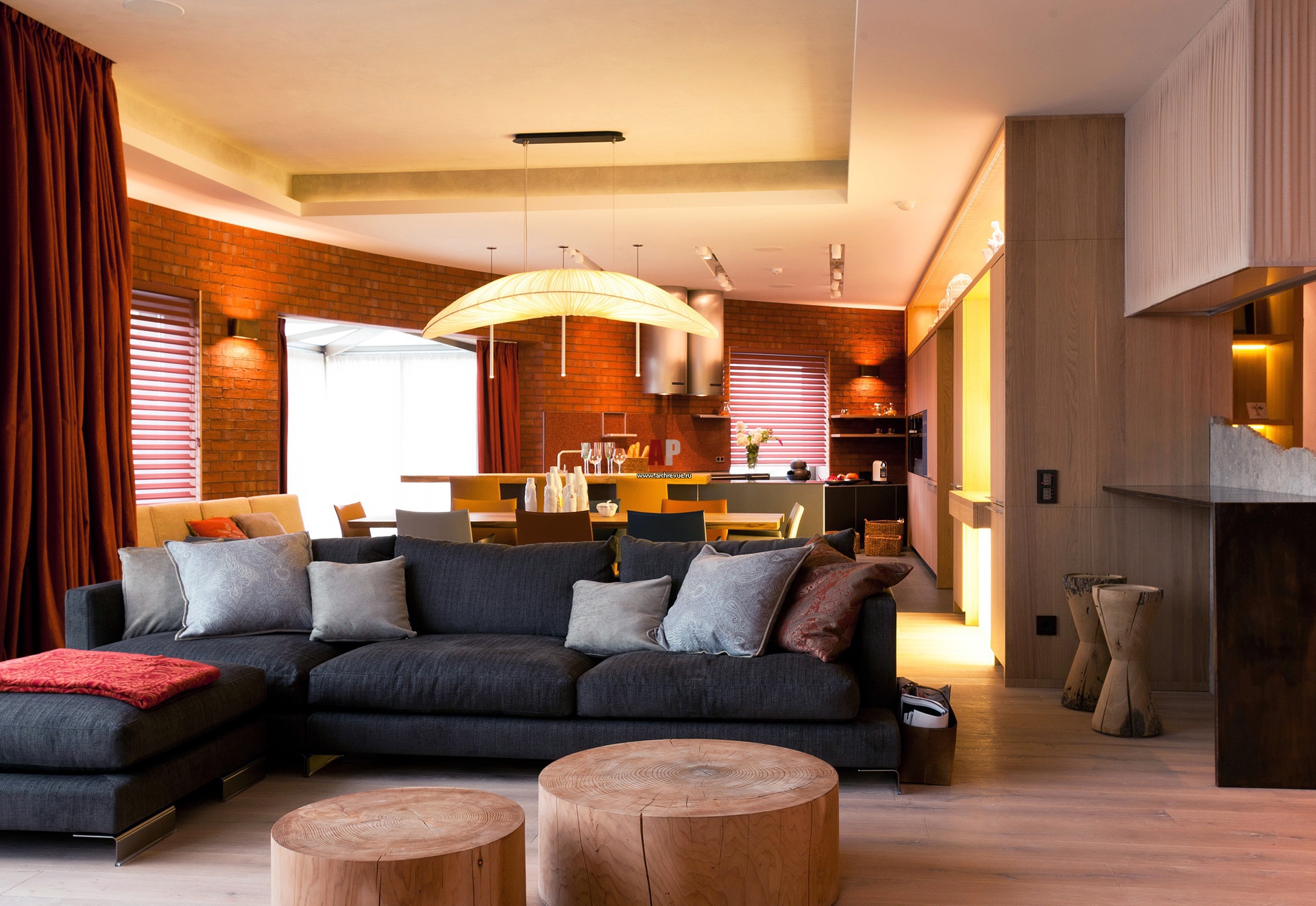 Фото интерьера гостиной в эко стиле. Круглые столки из кедра, барные стулья из венецианский свай, Riva 1920. Угловой диван в теменной обивке с приятной на ощупь фактурой. Лицевой керамический кирпич Terca, Wienerberger.