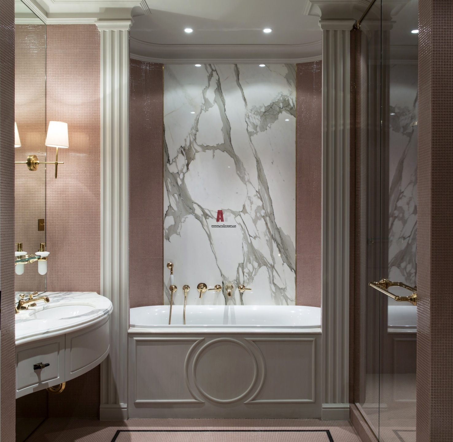 Ванная комната в отделке розовым камнем при женском кабинете. Сантехника, Villeroy & Boch. Смесители, Dornbracht.