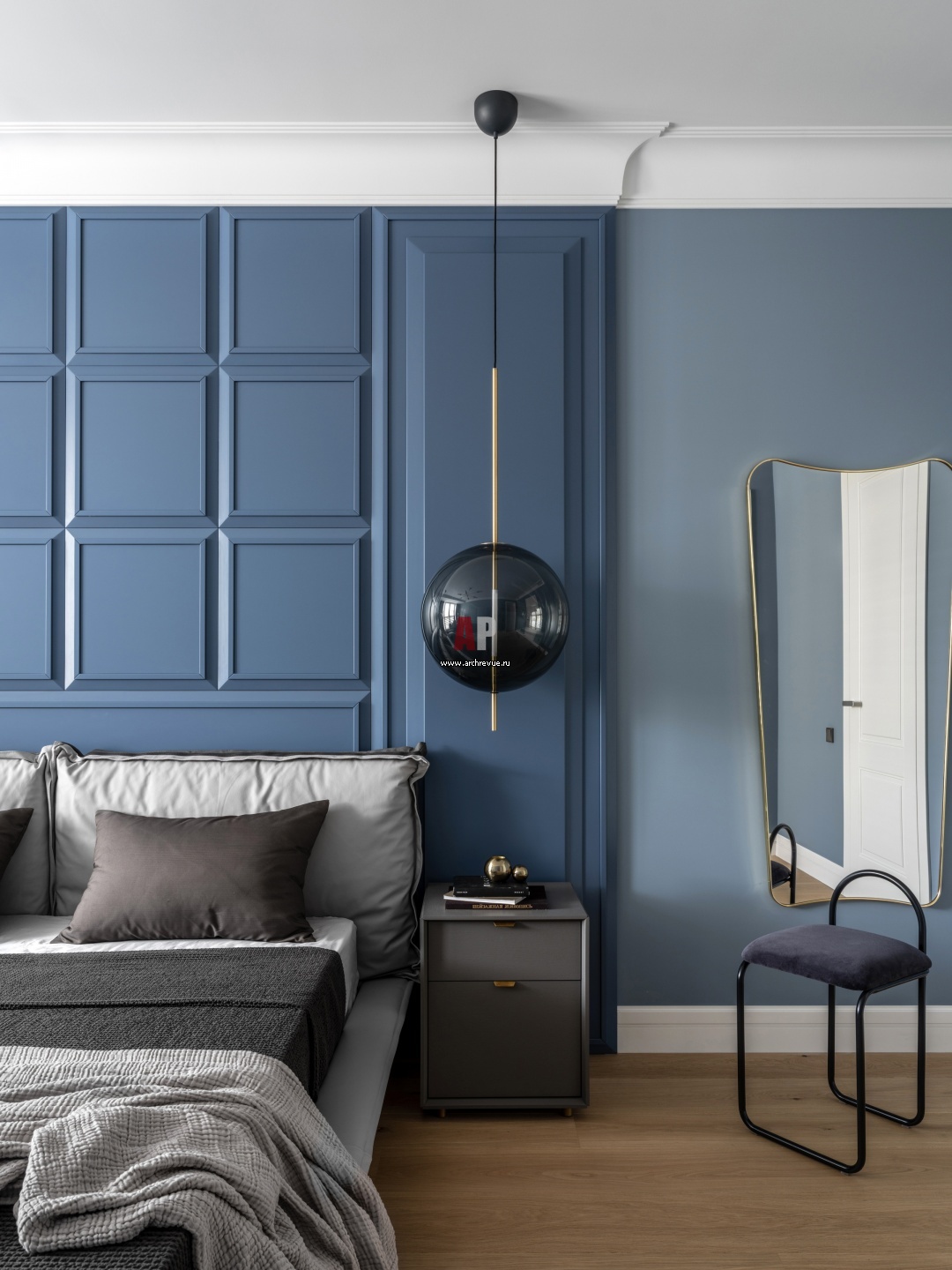 Интерьер спальни. Прикроватная тумба, Blu Dot. Над ней подвесной светильник, Pholc. Стул, AYTM.