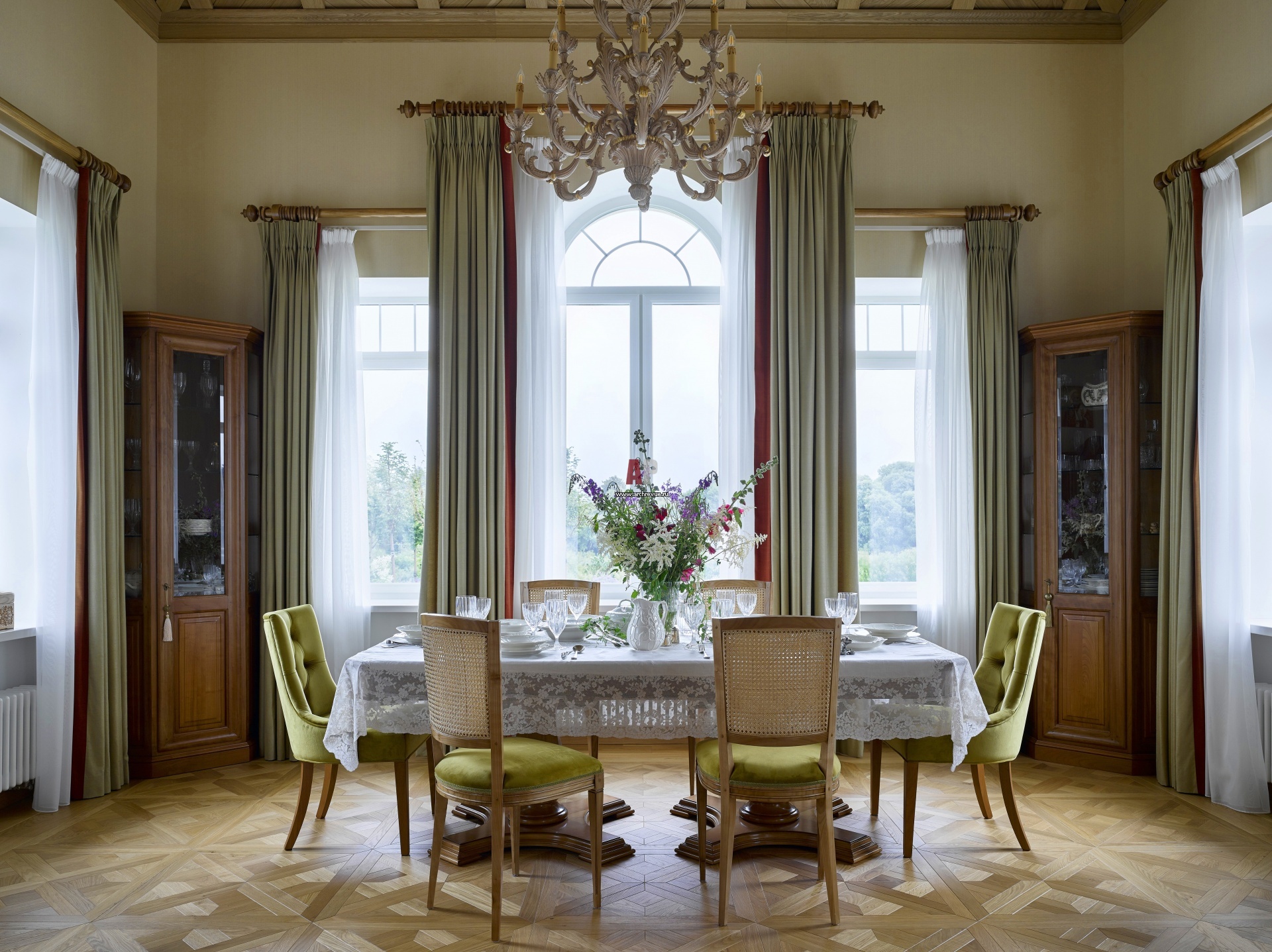 Столовая группа акцентирована композицией с центральным арочным окном. обеденный стол, стулья, шкафы, Stella del mobile.