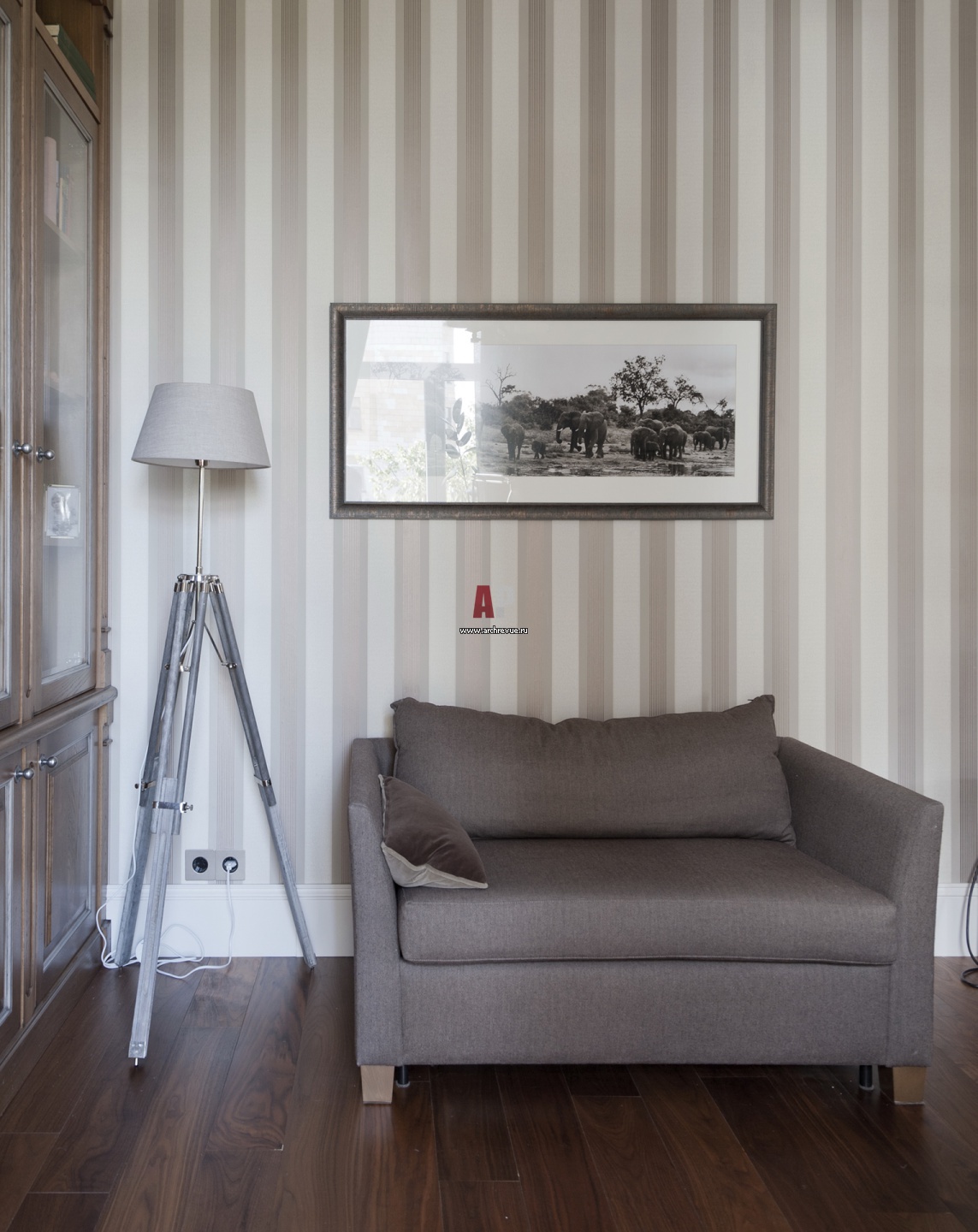 Мягкая группа в приватной гостиной нижнего этажа. Обои в полоску пастельного серо-бежевого цвета. Обивка кресла сочетается с цветовой гаммой рисунка обоев.