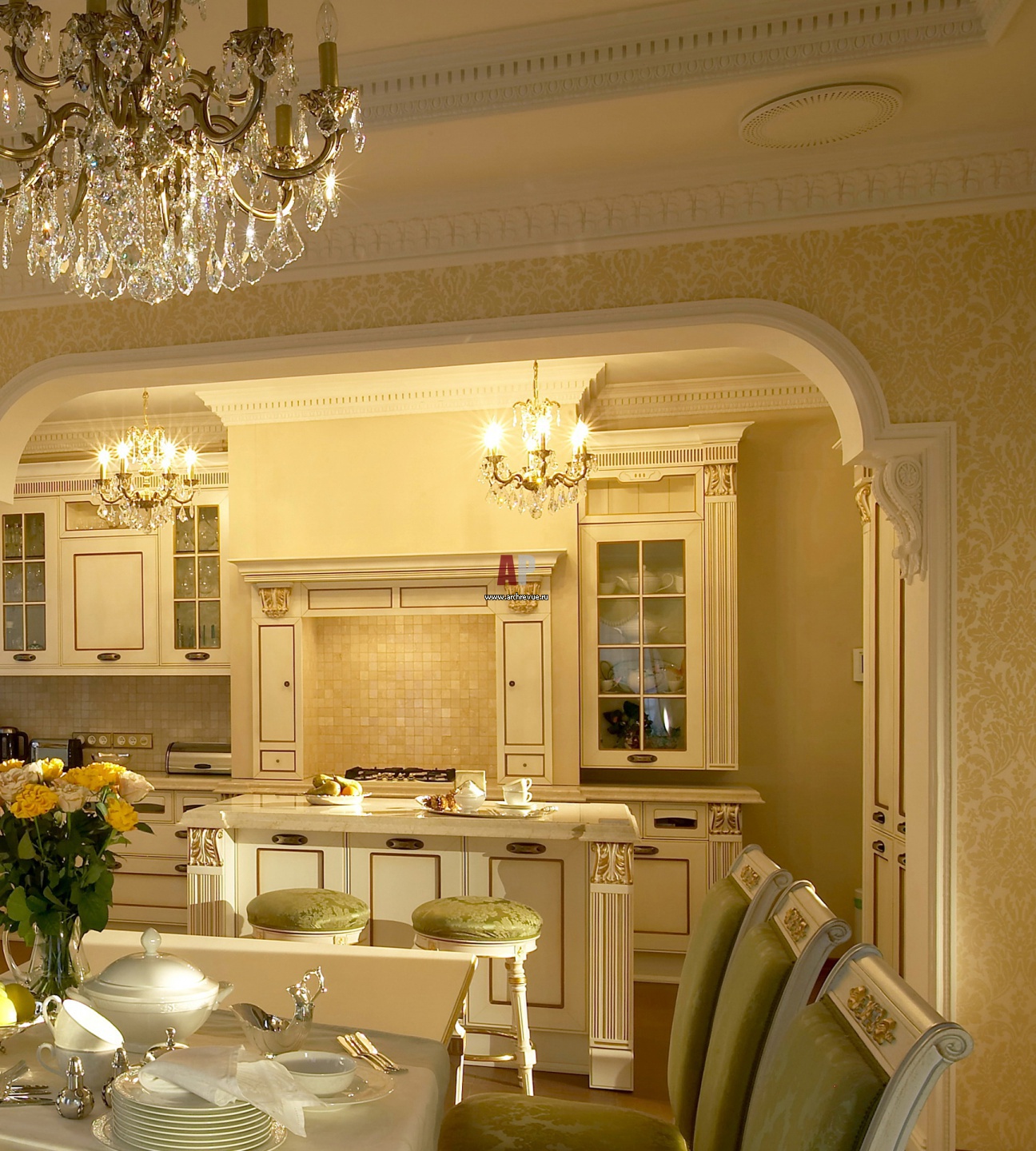 Вид на кухню со стороны столовой. Белая кухонная мебель с позолотой Aster Cucine из классической серии. Портал украшен лепным декором, изготовление «Триглиф».