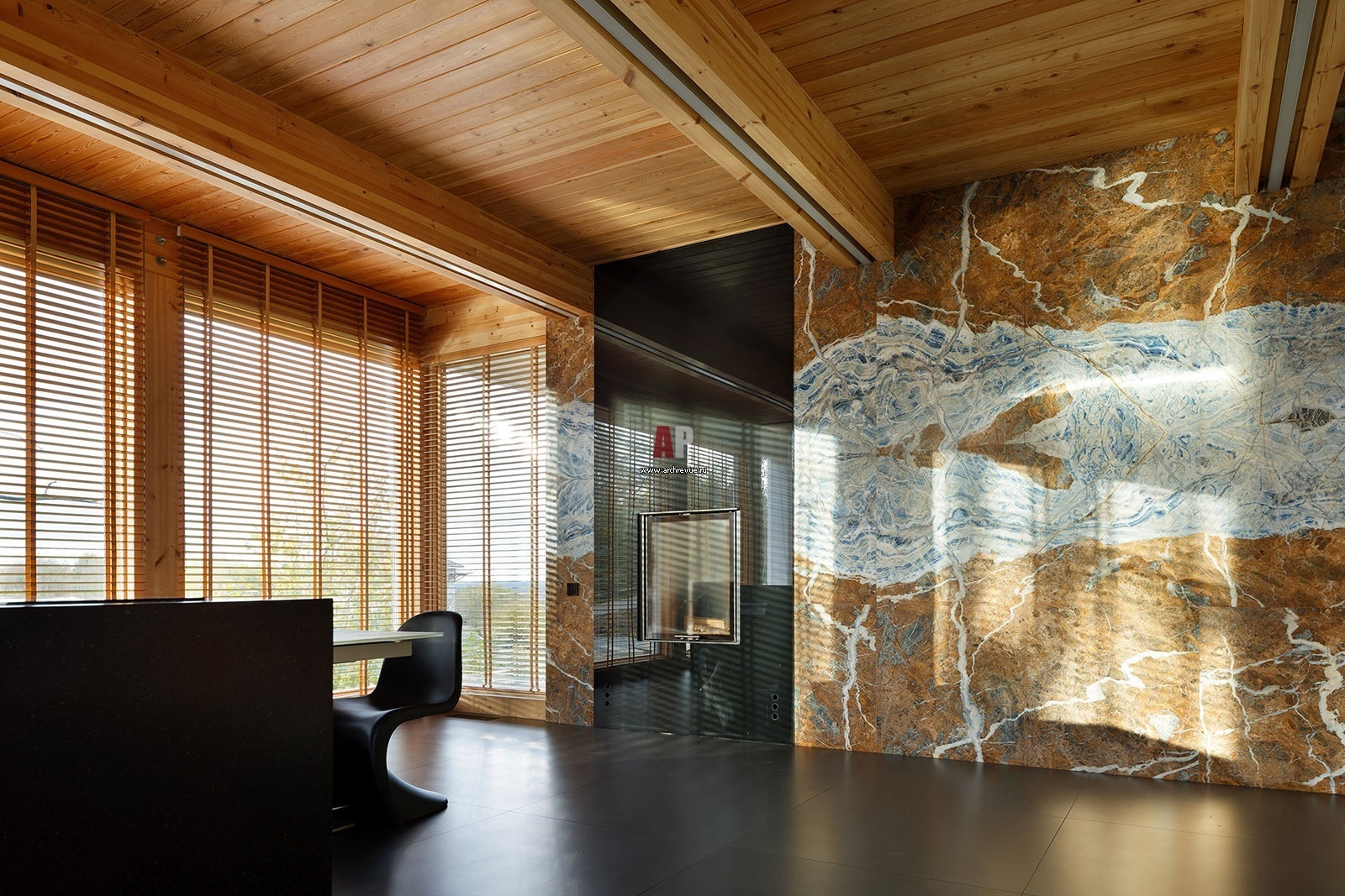 В зона отдыха СПА-комплекса стена облицована редчайшим мрамором сорта Blue Jeans. Кресло, Vitra.