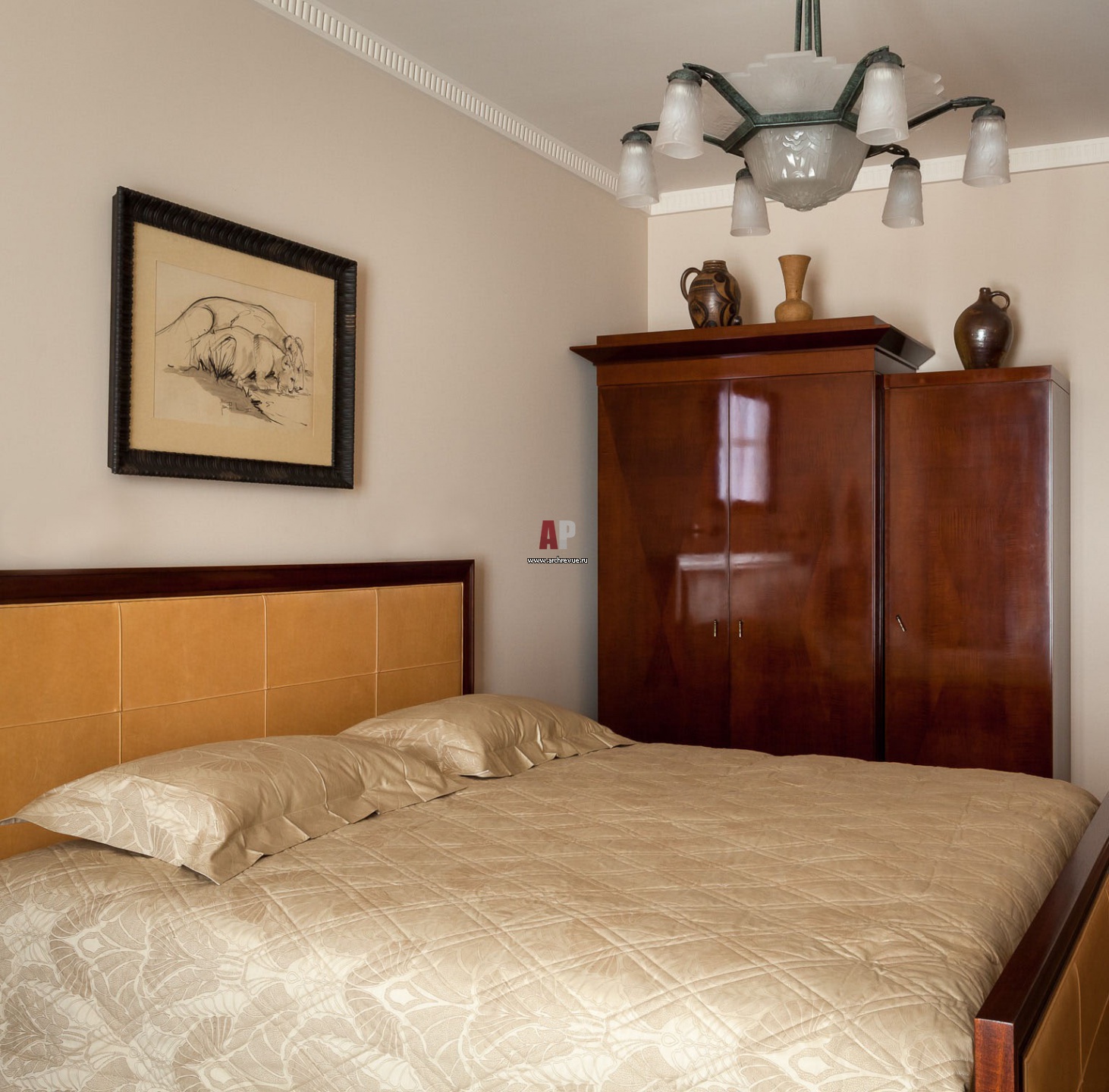 Интерьер спальни с мотивами ар-деко. Кровать с изголовьем из кожи, Baker. Шкаф из полированного дерева Baker сделан по эскизу декоратора. Антикварная люстра 1930-х годов привезена из Франции.