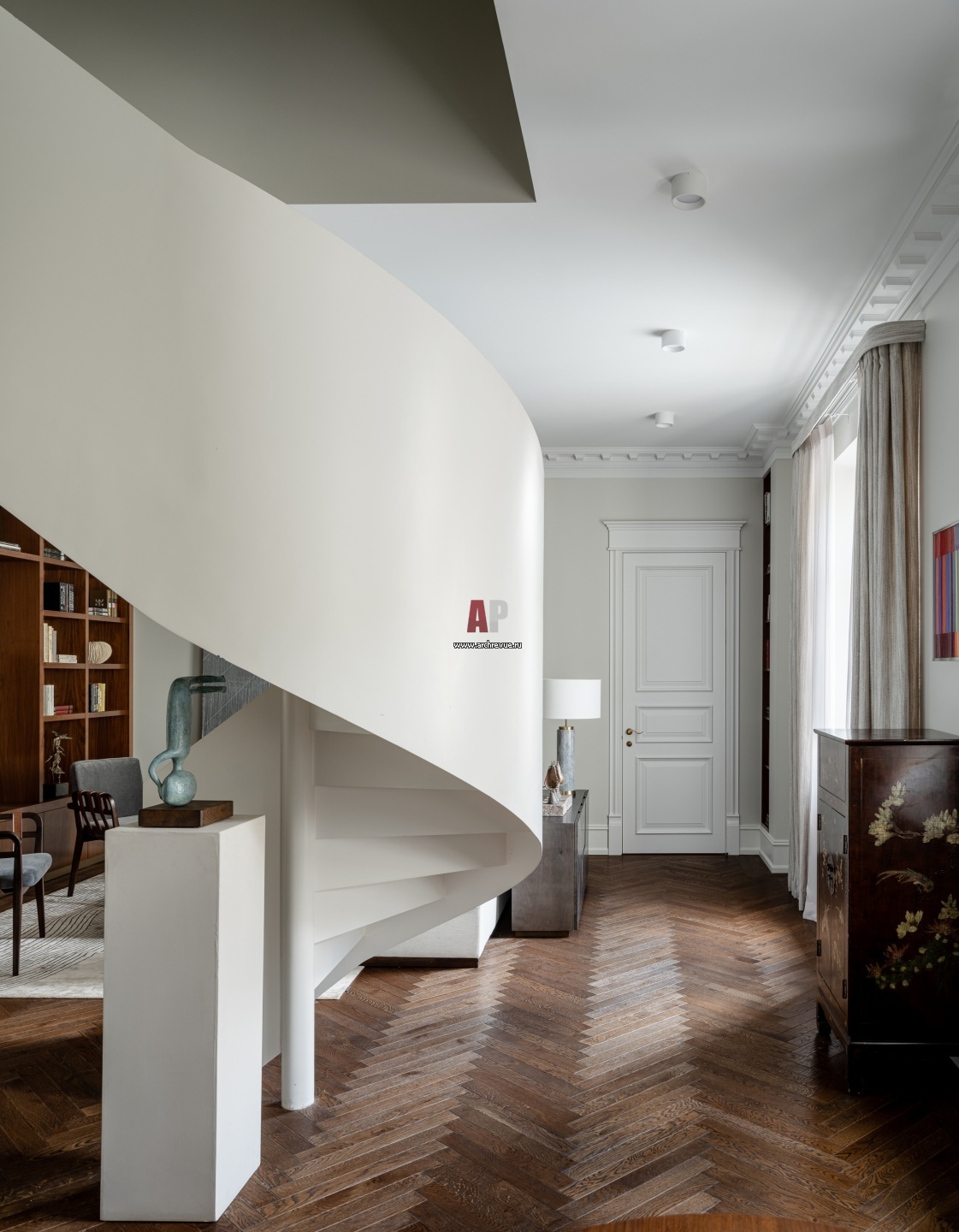 Квартира обращена в тенистый двор, поэтому в оформлении использована светлая цветовая палитра. Монохром разбавляет теплая фактура американского ореха и дуба. На оси первого этажа – вход в спальню.
