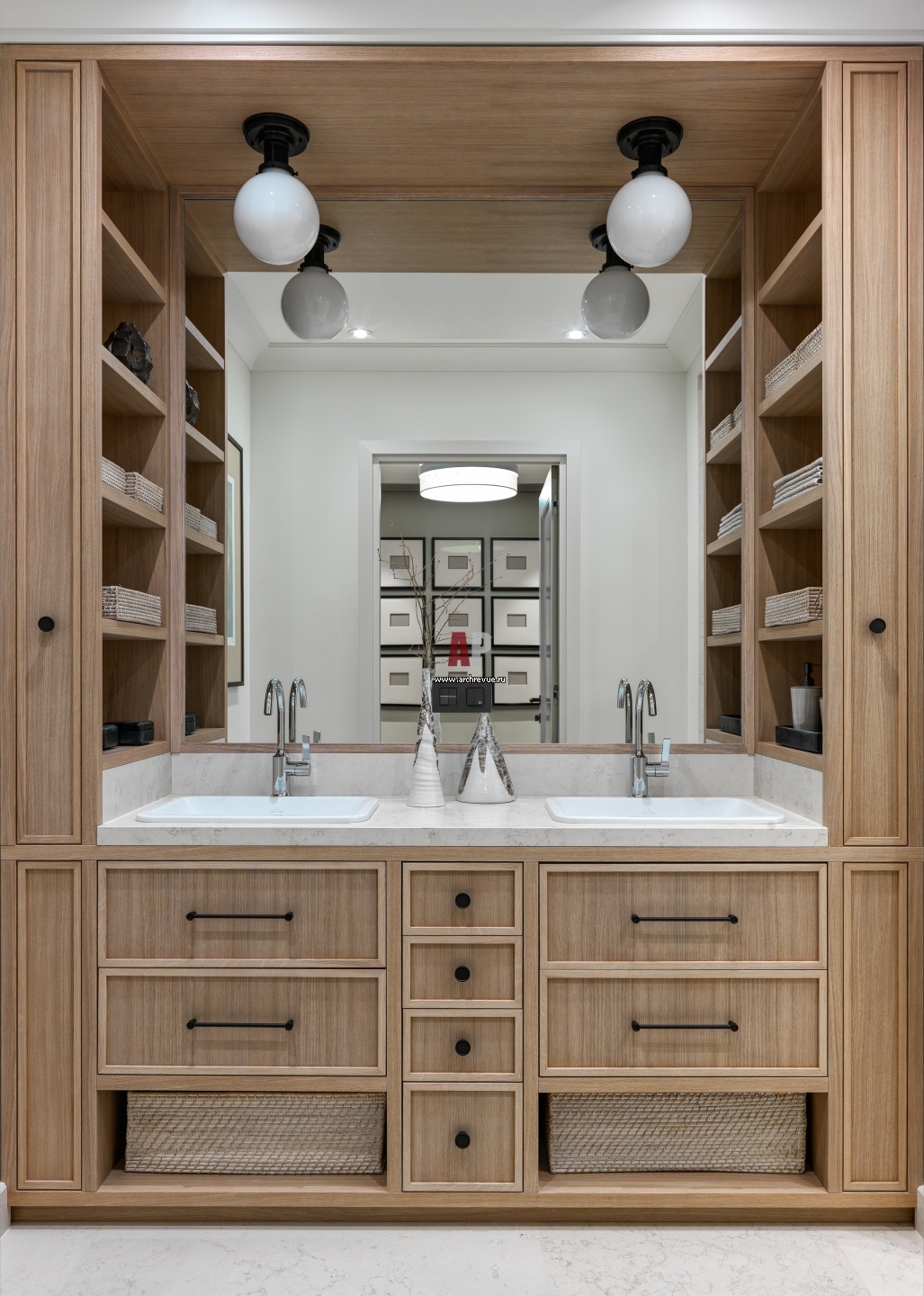 Умывальник в детском санузле сделан на заказ. Потолочные светильники, Ralph Lauren. Сантехника, Villeroy & Boch, Dornbracht.