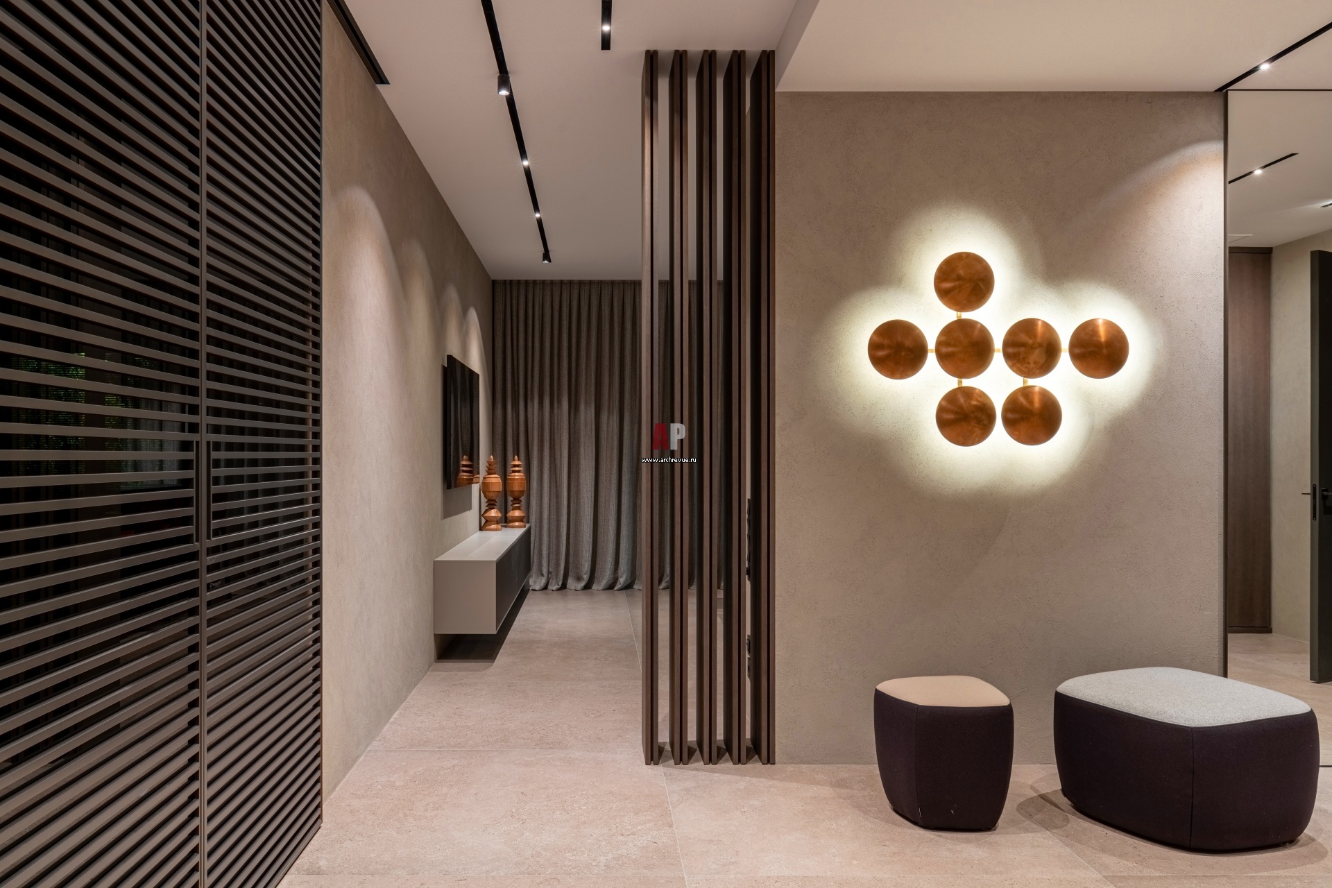 Интерьер прихожей. На стенах штукатурка под бетон. Пуфы, Walter Knoll. Раздвижные перегородки, Rimadesio. Свет, Henge.