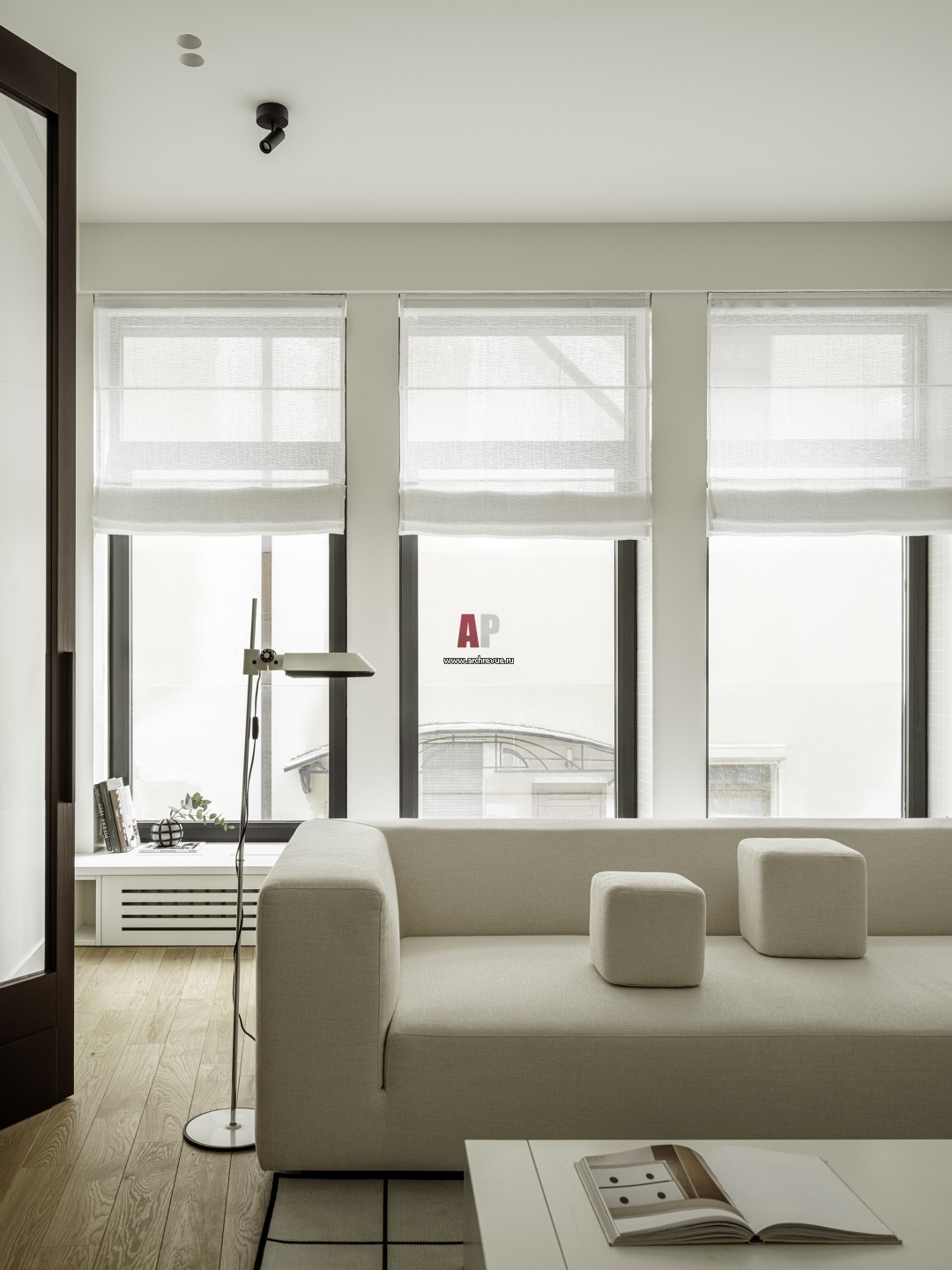 Много окон с низкими подоконниками позволили обыграть их для места для отдыха или системы хранения. Например, окна гостиной объединены длинной лавкой, где можно разместить большую компания.