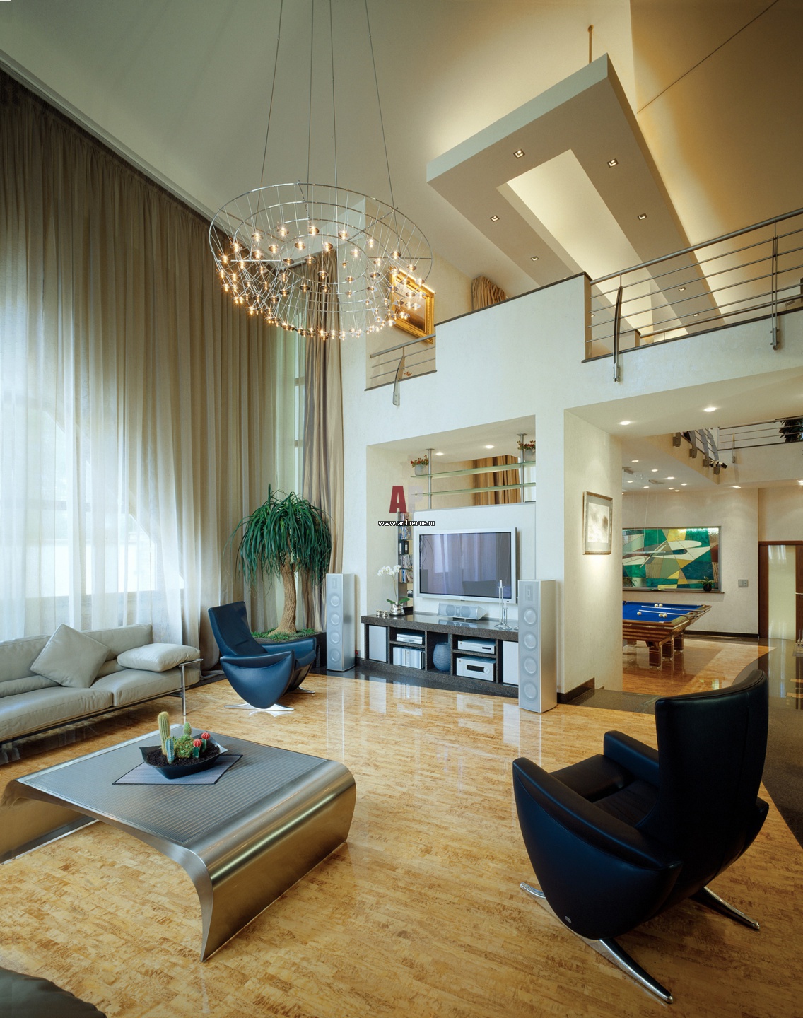 Гостиная с элементами стиля техно. Из прихожей, опускаясь на пол-уровня вниз, попадаешь в зону гостиной. Высокое помещение сформировано наклонными несущими стенами.