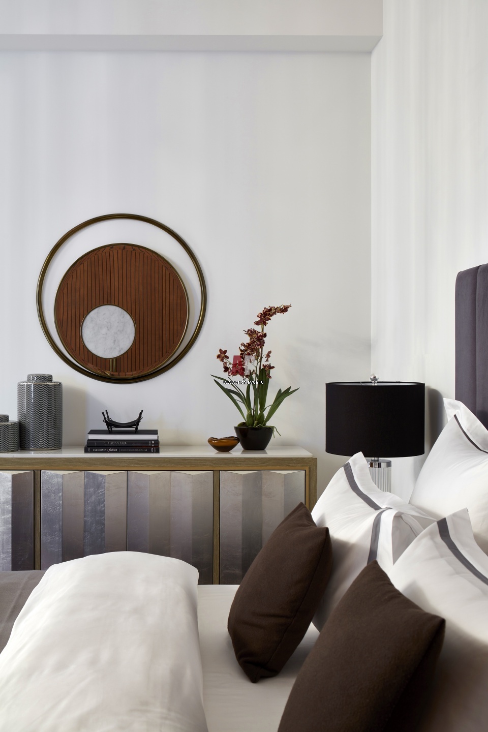 Гостевая спальня. Стены окрашены матовой белой краской, Benjamin Moore. Круглое декоративное панно, Theodore Alexander.