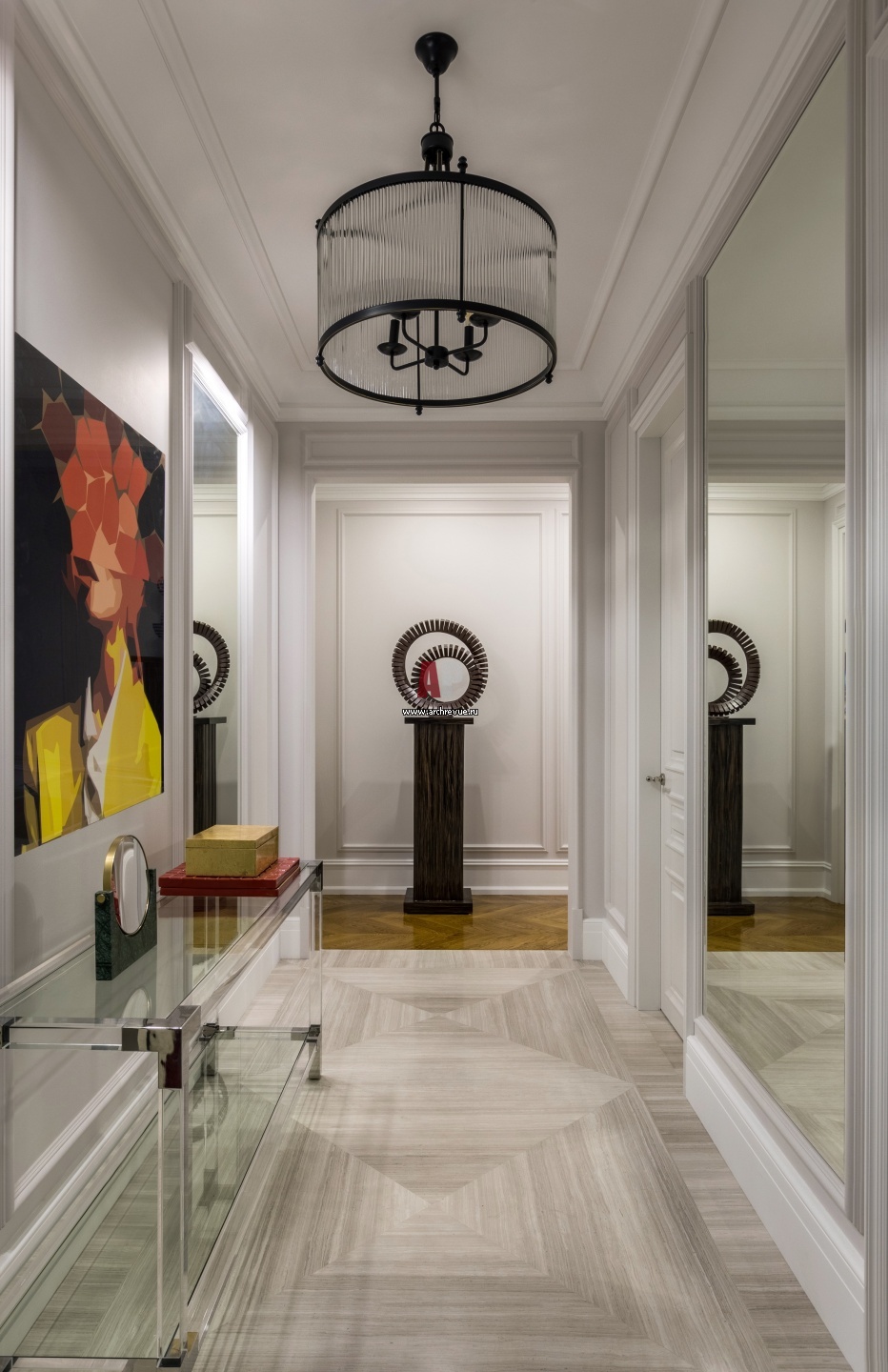 Входная группа отделана крупноформатным светлым камнем с геометрическим рисунком. Зеркало в полный рост увеличивает пространство.