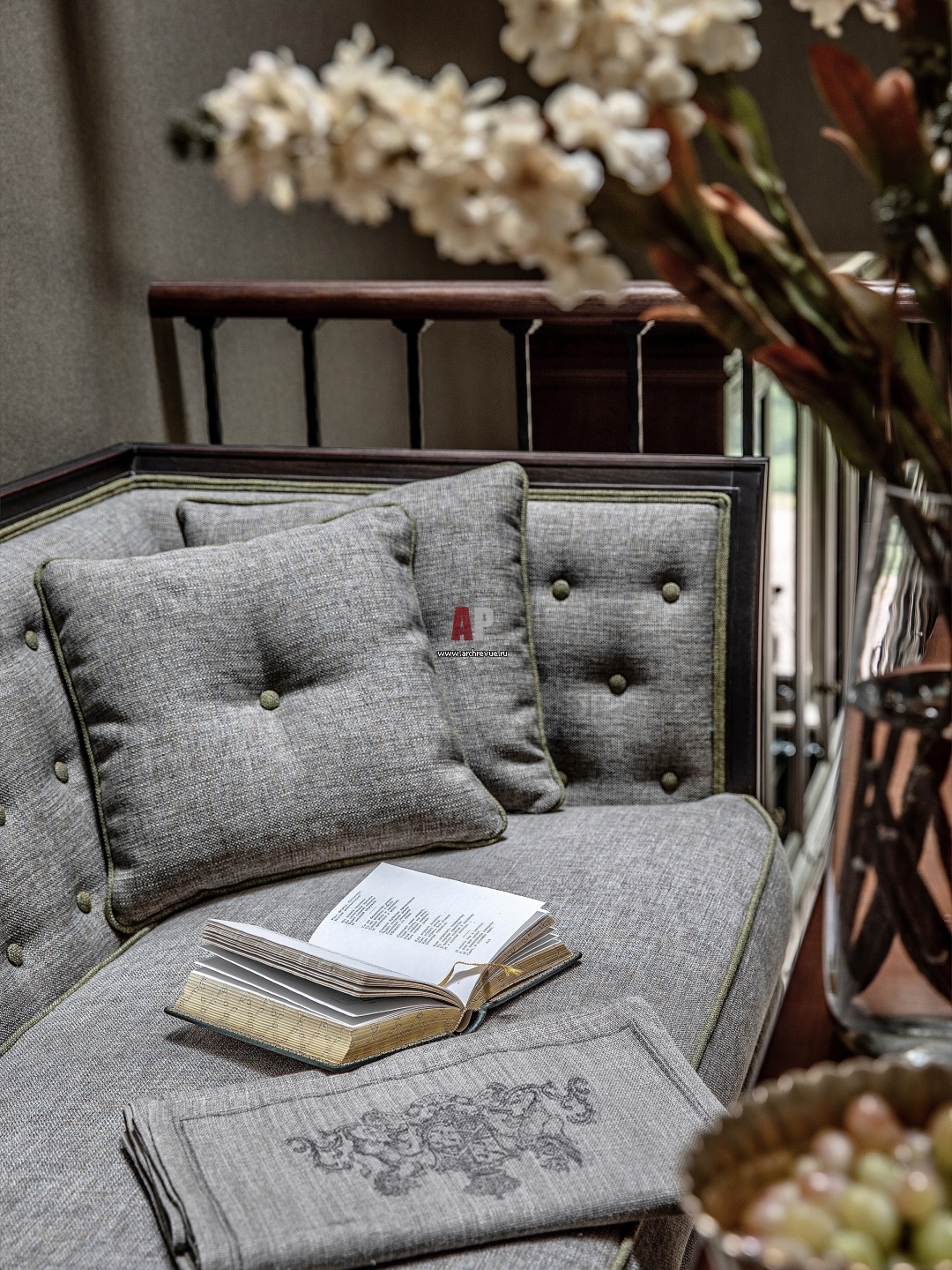 Интерьер общей зоны с приглушенной цветовой гаммой, приятными на ощупь материалами и обволакивающей атмосферой.