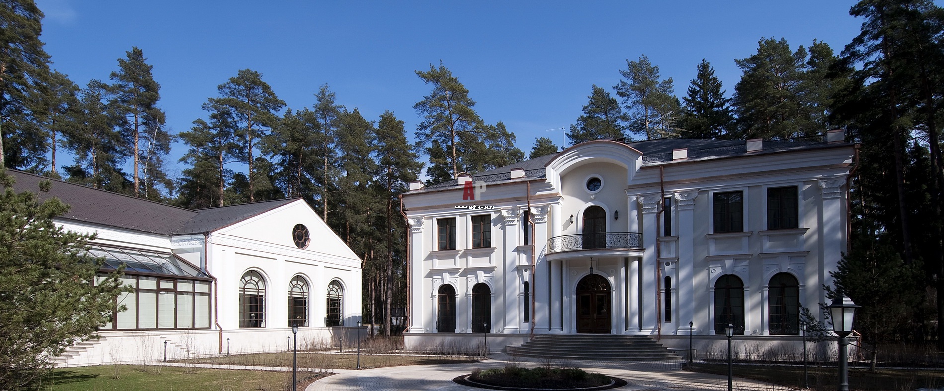 Фасад главного дома оформлен в лучших традициях классической школы. Кроме него на участке располагается здание бассейна.