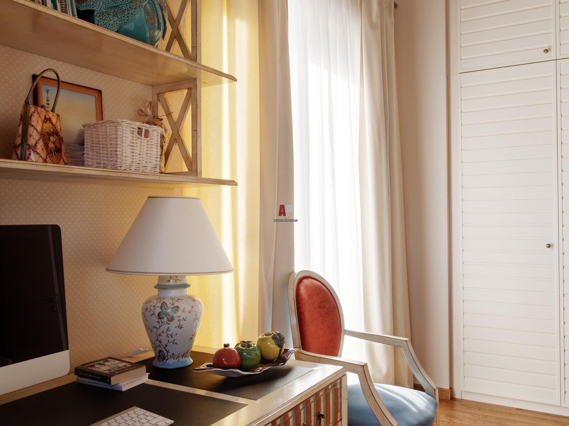 Фото интерьера спальни в светлых тонах с белым встроенным шкафом.