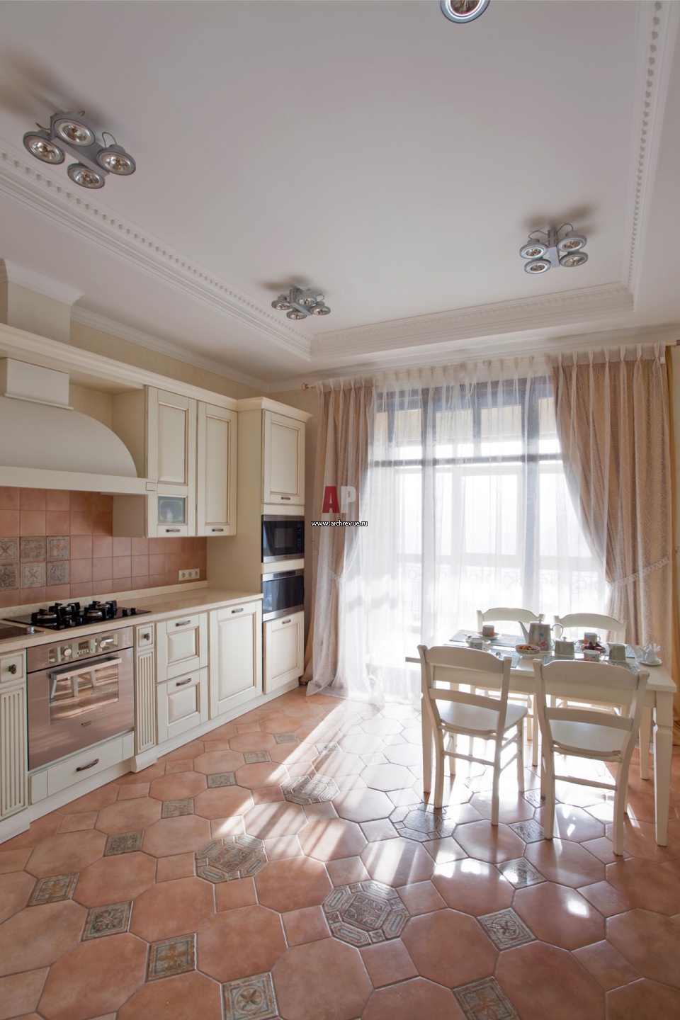 Стол для завтраков на кухне из белого дерева. Шестиугольная плитка природного терракотового оттенка с тиснением добавляет интерьеру кухни традиционный национальный колорит.
