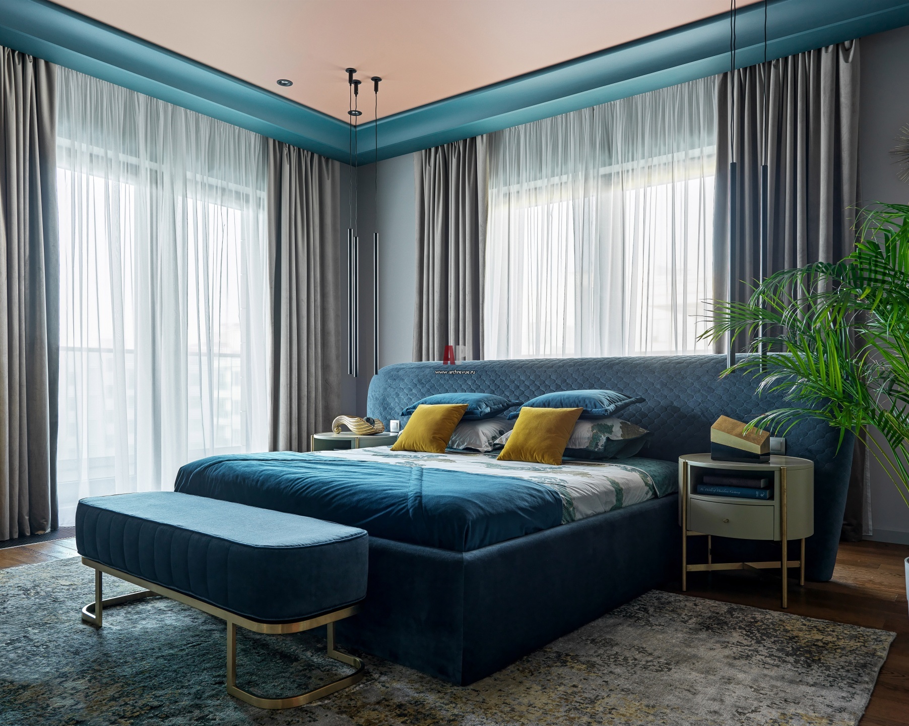 Главная спальня не соприкасается напрямую ни с одним из общих помещений, что обеспечивает ее максимальную звукоизоляцию от остальной квартиры. Стены и карнизы выкрашены в разные оттенки синего. Потолок оформлен в цвете закатного неба. Кровать и тумбы сделаны на заказ.