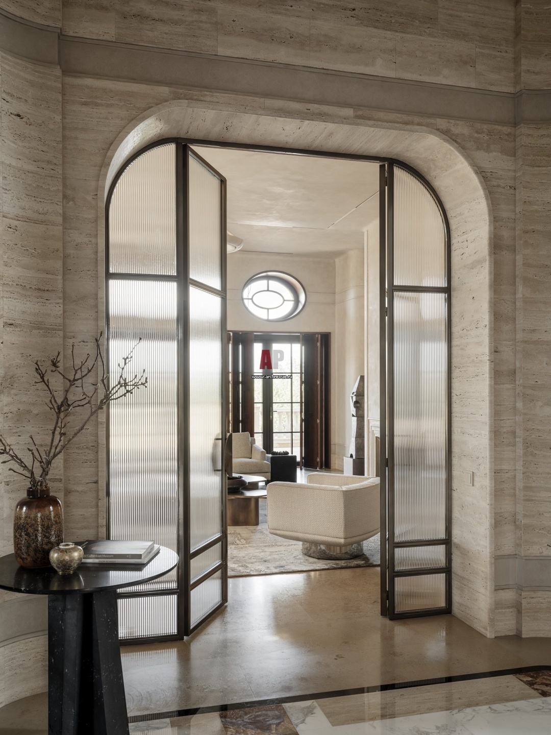 Элегантная роскошь. Загородный дом с чувственным дизайном. Интерьер холла. В интерьере используется декоративная лепнина: аккуратные молдинги формируют ордерную систему.
