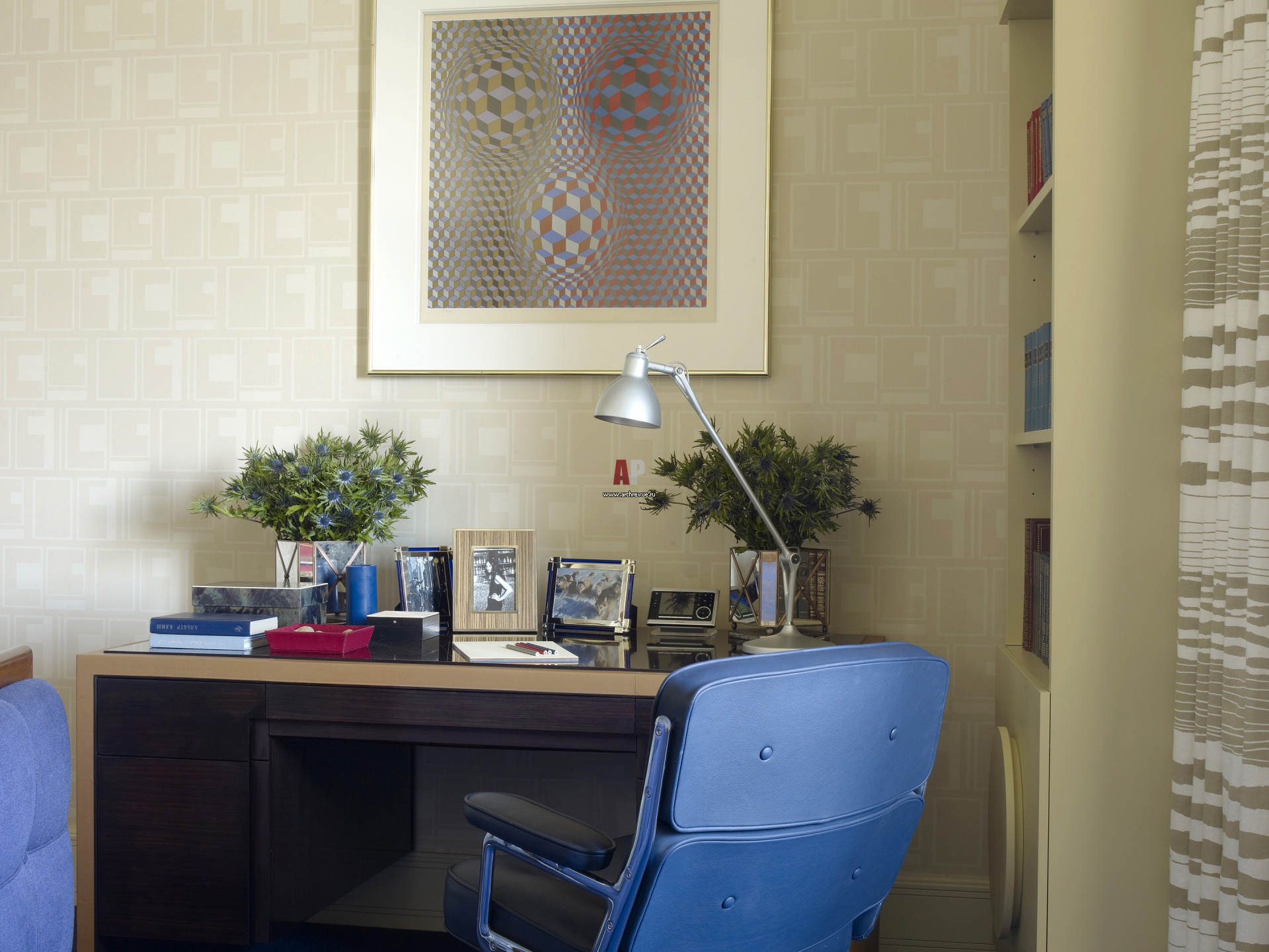 Рабочая зона в спальне сына оформлена в духе американских интерьеров. Кресло из синей кожи. Работа над письменным столом выполнена в стиле опт-арта.