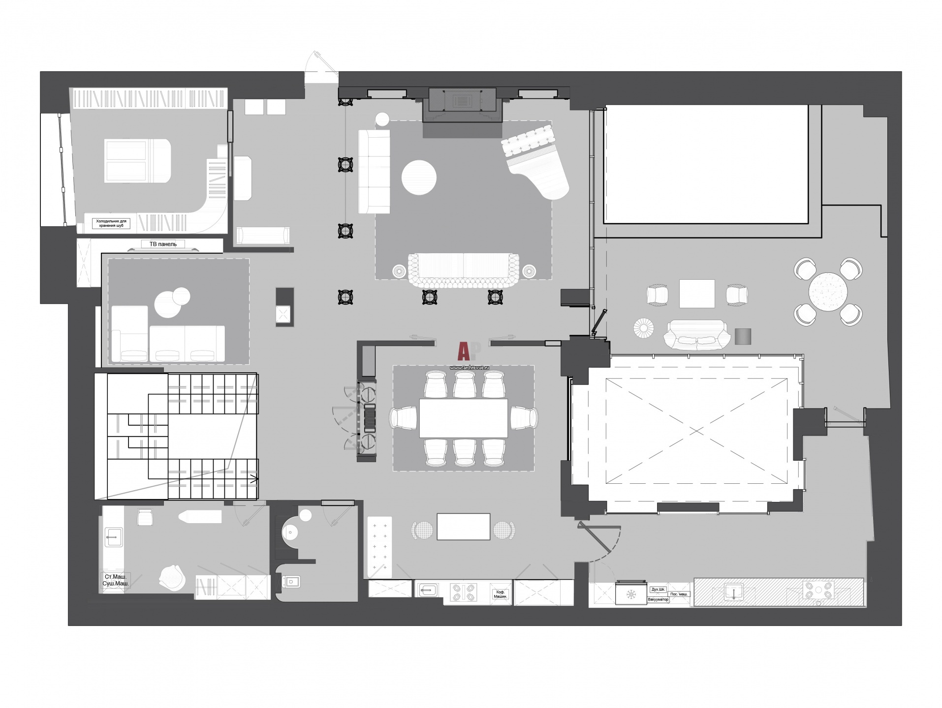 План первого этажа двухэтажного пентхауса в историческом особняке.