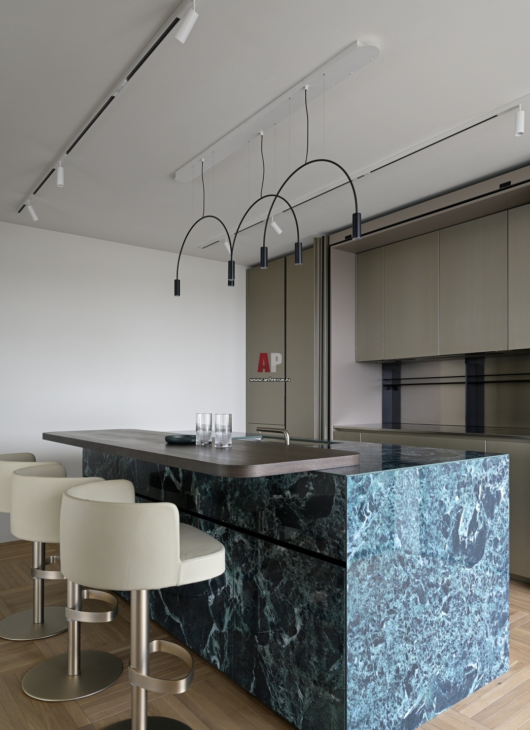 Кухня с островом, отделанным сине-изумрудным камнем. Барные стулья, Longhi. Светильник над островом, Estiluz.