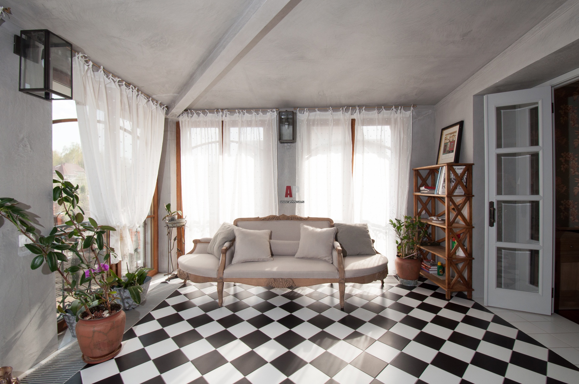 Зимний сад в стиле Прованс. На полу – графичная раскладка из черно-белой плитки. Диван в стиле французской неоклассики Flamant, поставщик LEFORM.