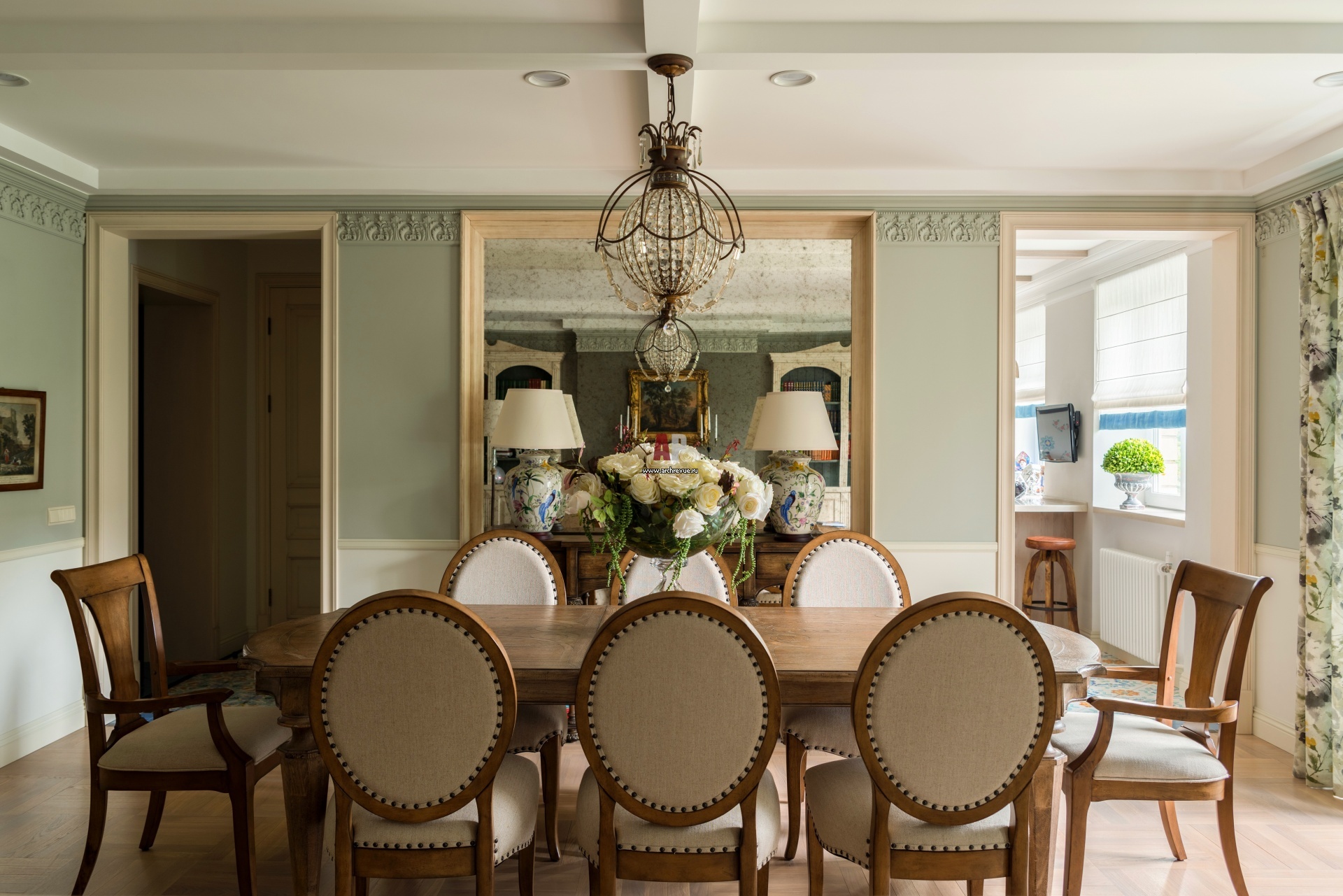 Столовая группа в гостиной. Стол, стулья, Hooker. Люстра, антиквариат. Состаренное зеркало в тонкой дубовой раме на всю высоту увеличивает помещение.