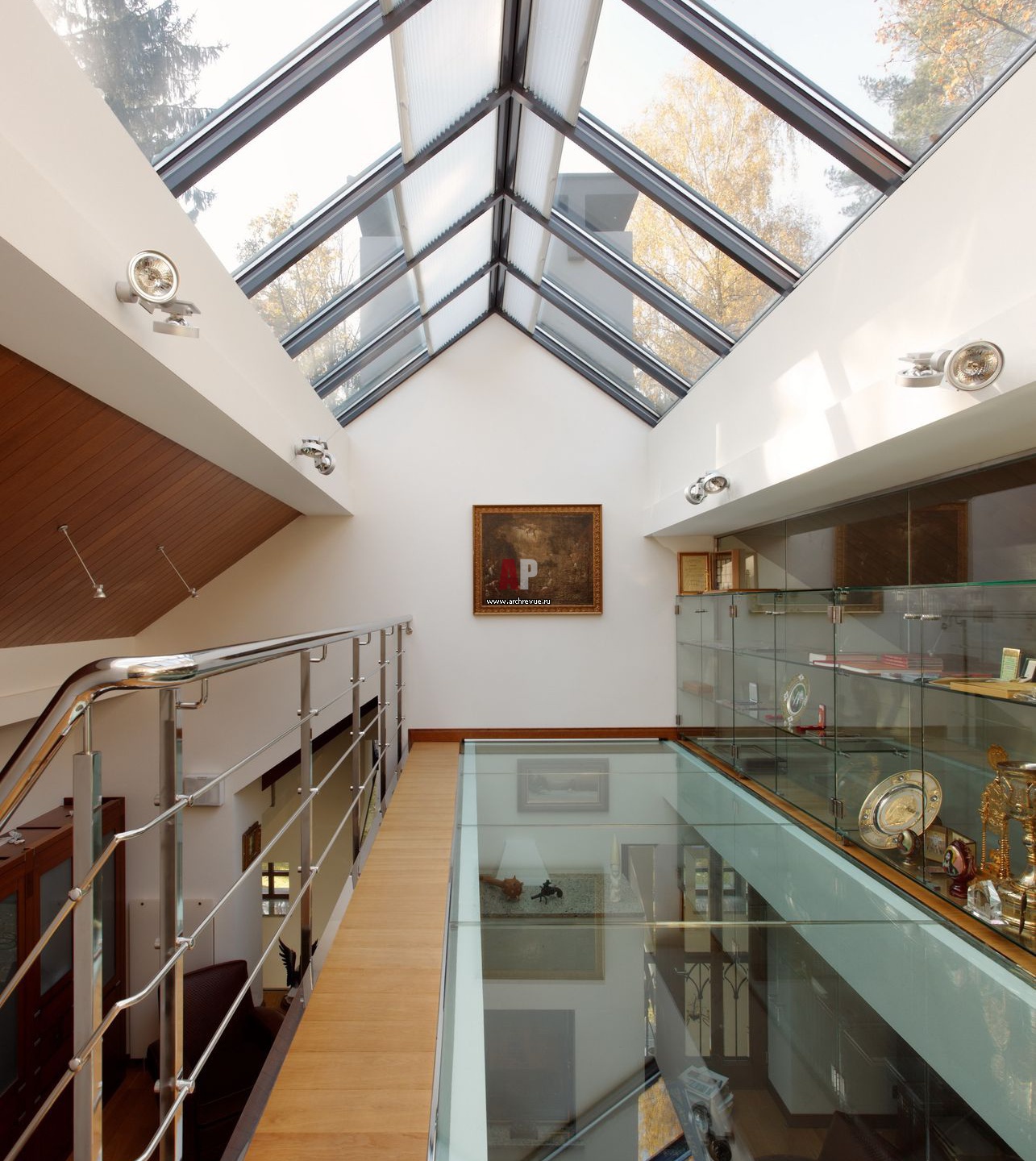 Второй уровень кабинета - частная галерея. Пол и потолок здесь выполнены из стекла, которое не препятствует проникновению света на нижний уровень.