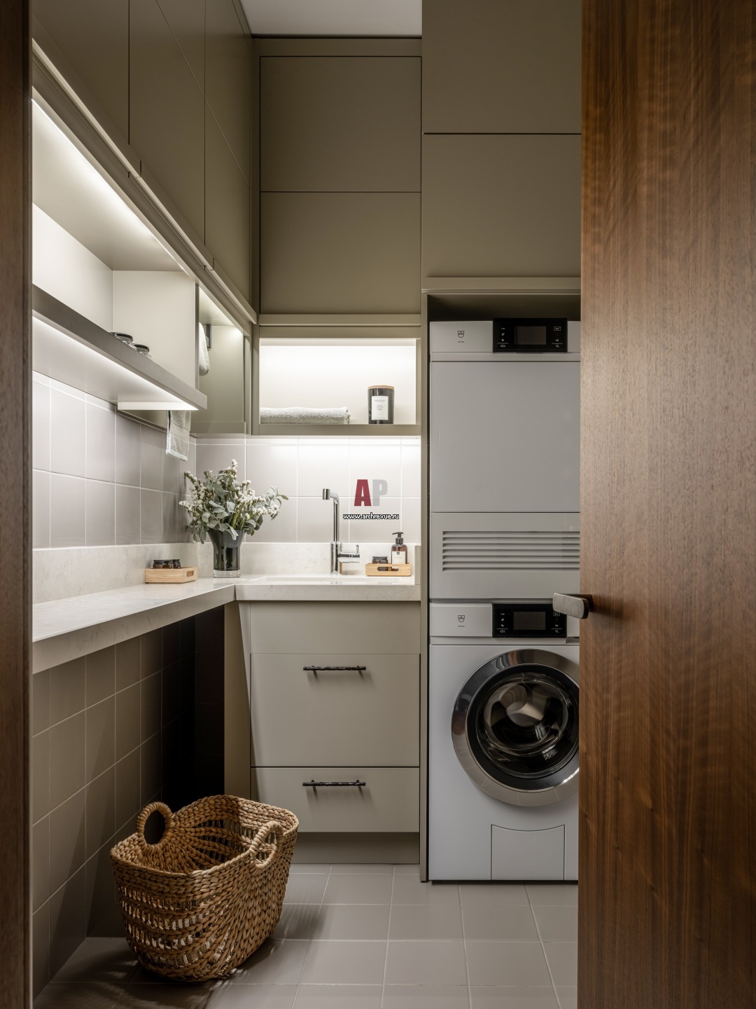 Постирочная. Техника для стирки и сушки белья, V-Zug. Двери в шпоне ореха от застройщика.