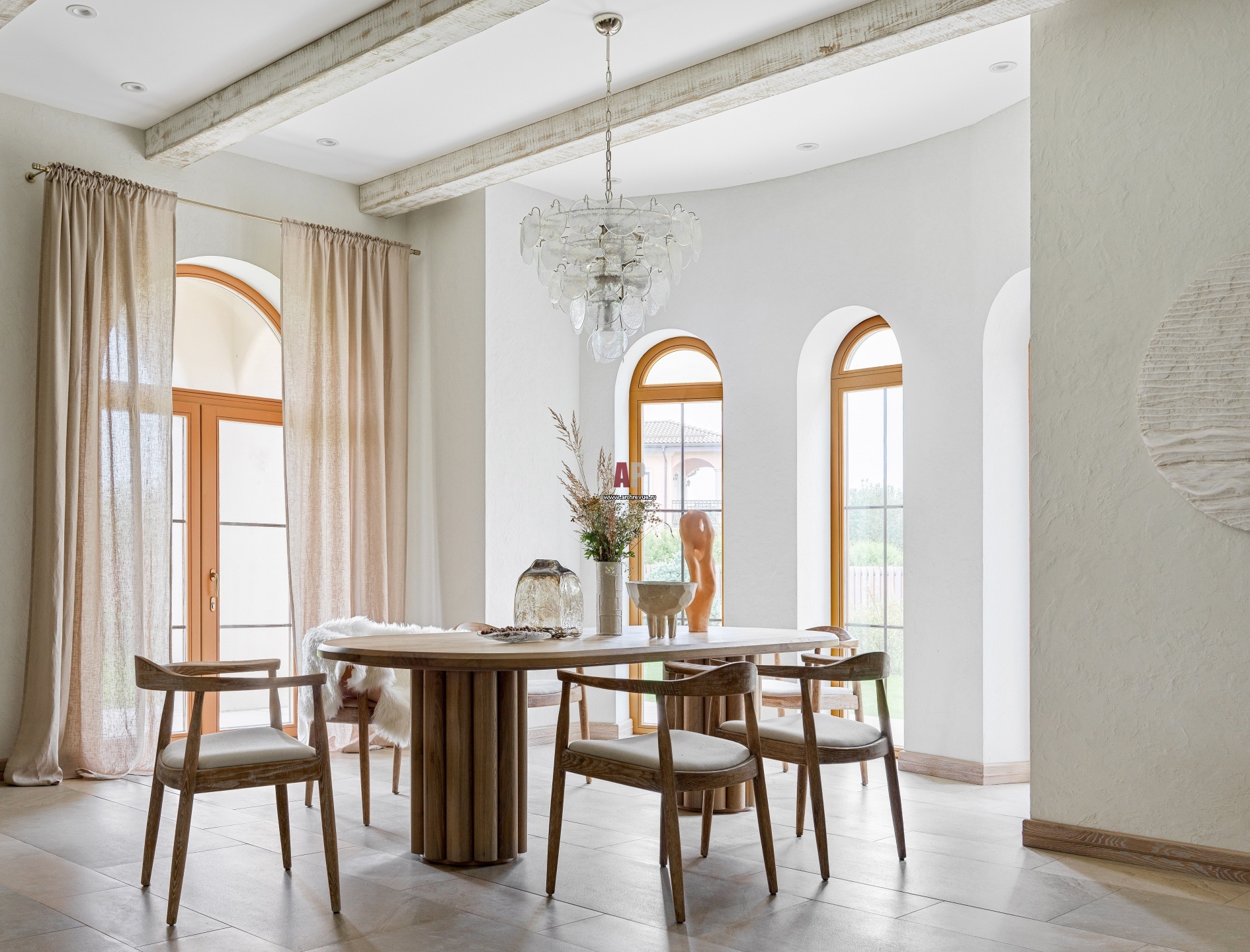 Столовая зона в эркере. Стол выполнен по эскизам дизайнера. Люстра, винтаж, 1970-е гг. Стулья привезены из Испании.