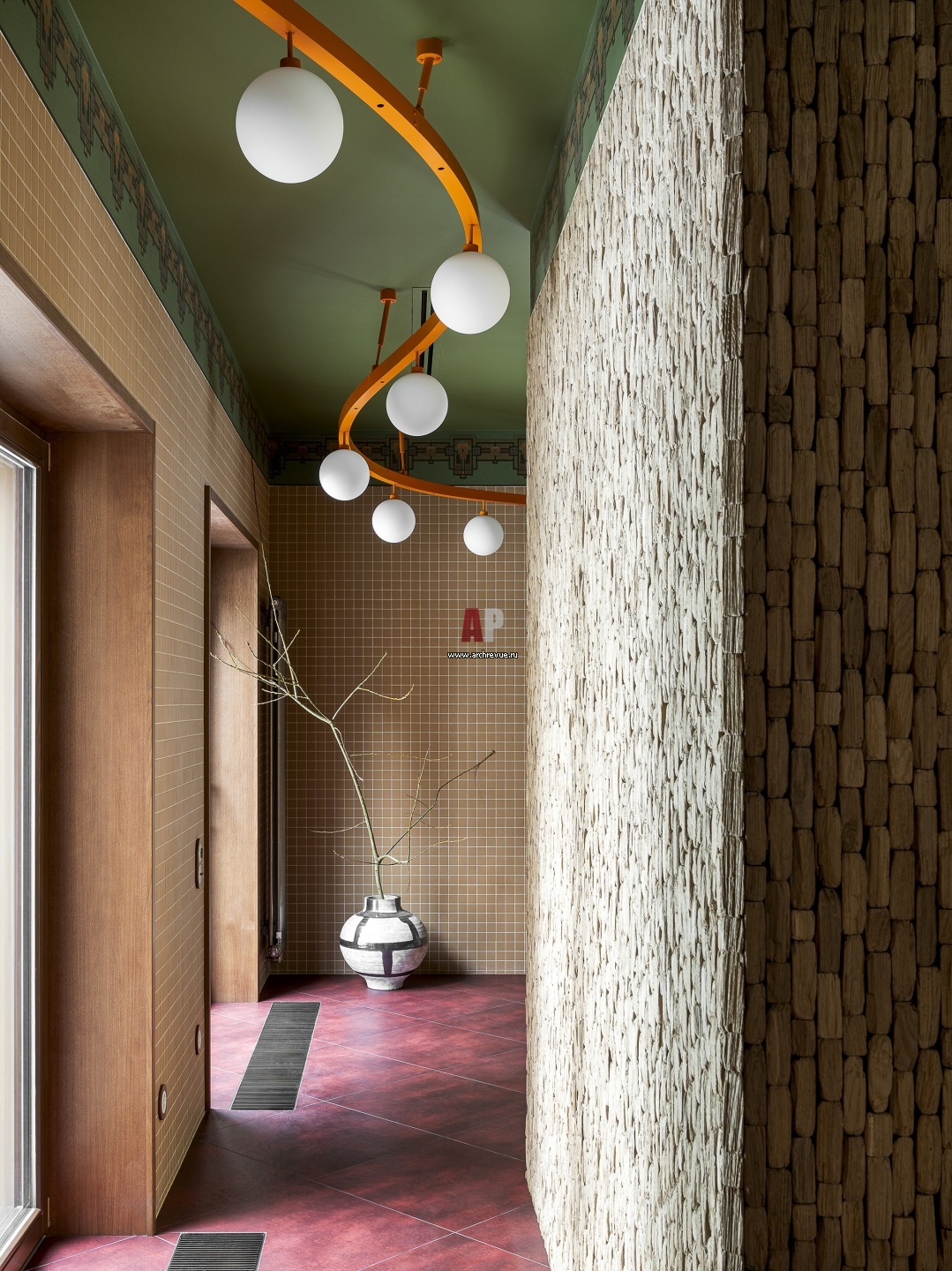 Зона отдыха с банным комплексом. Панели из бочонков, на заказ. Оранжевый светильник-лента, на заказ.