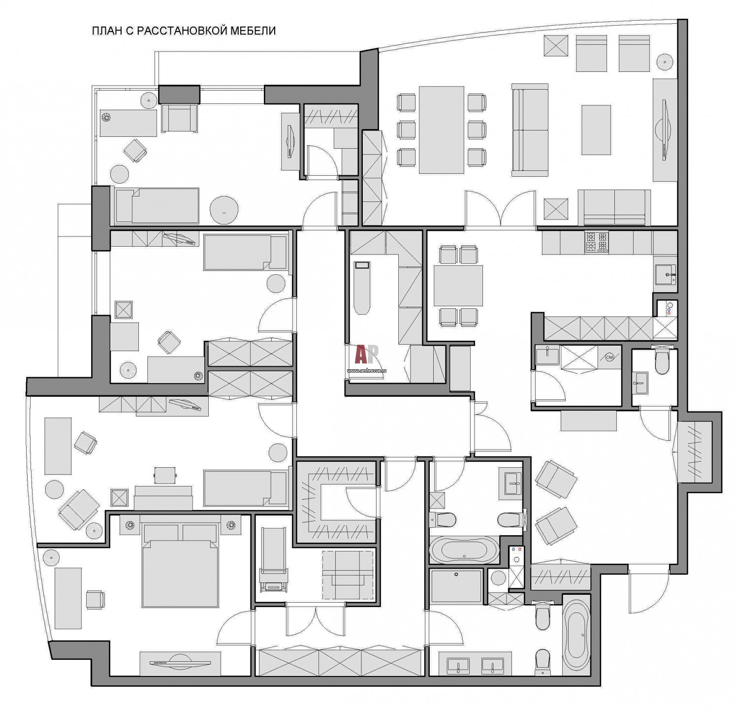 План квартиры с 4-мя спальнями и общей гостиной в монолитном доме.