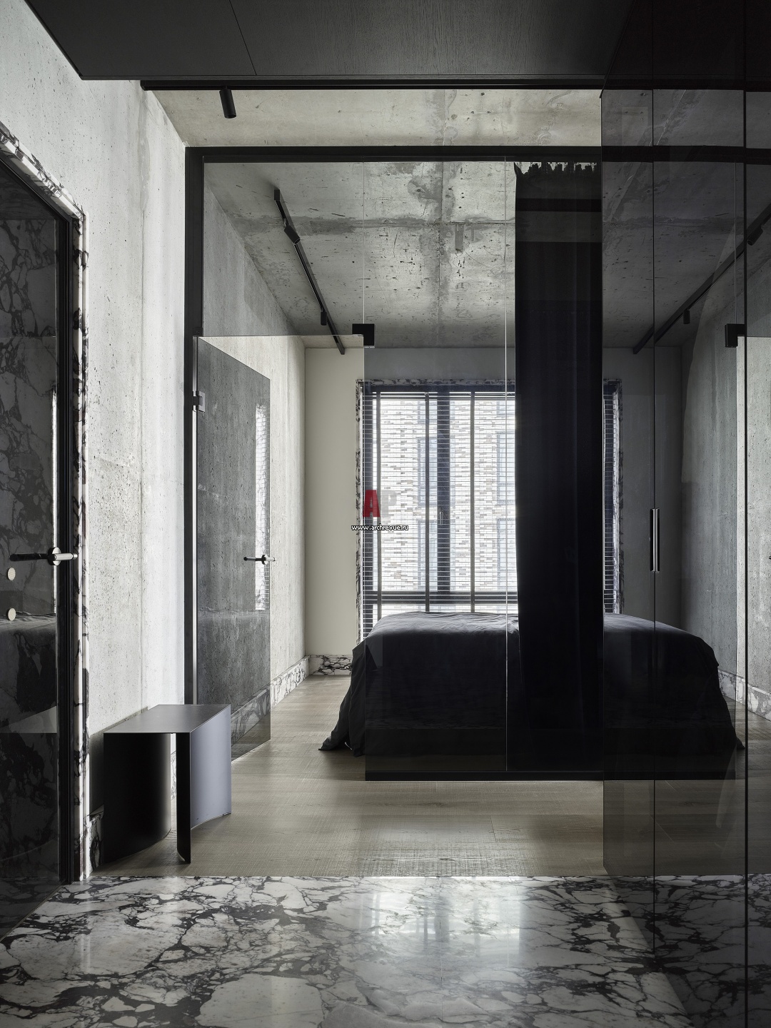 От прихожей спальня отделена стеклянной перегородкой из тонированного стекла, Rimadesio. Камерность помещению обеспечивают плотные портьеры. Стеновые панели, корпусная и встроенная мебель из дерева, на заказ.