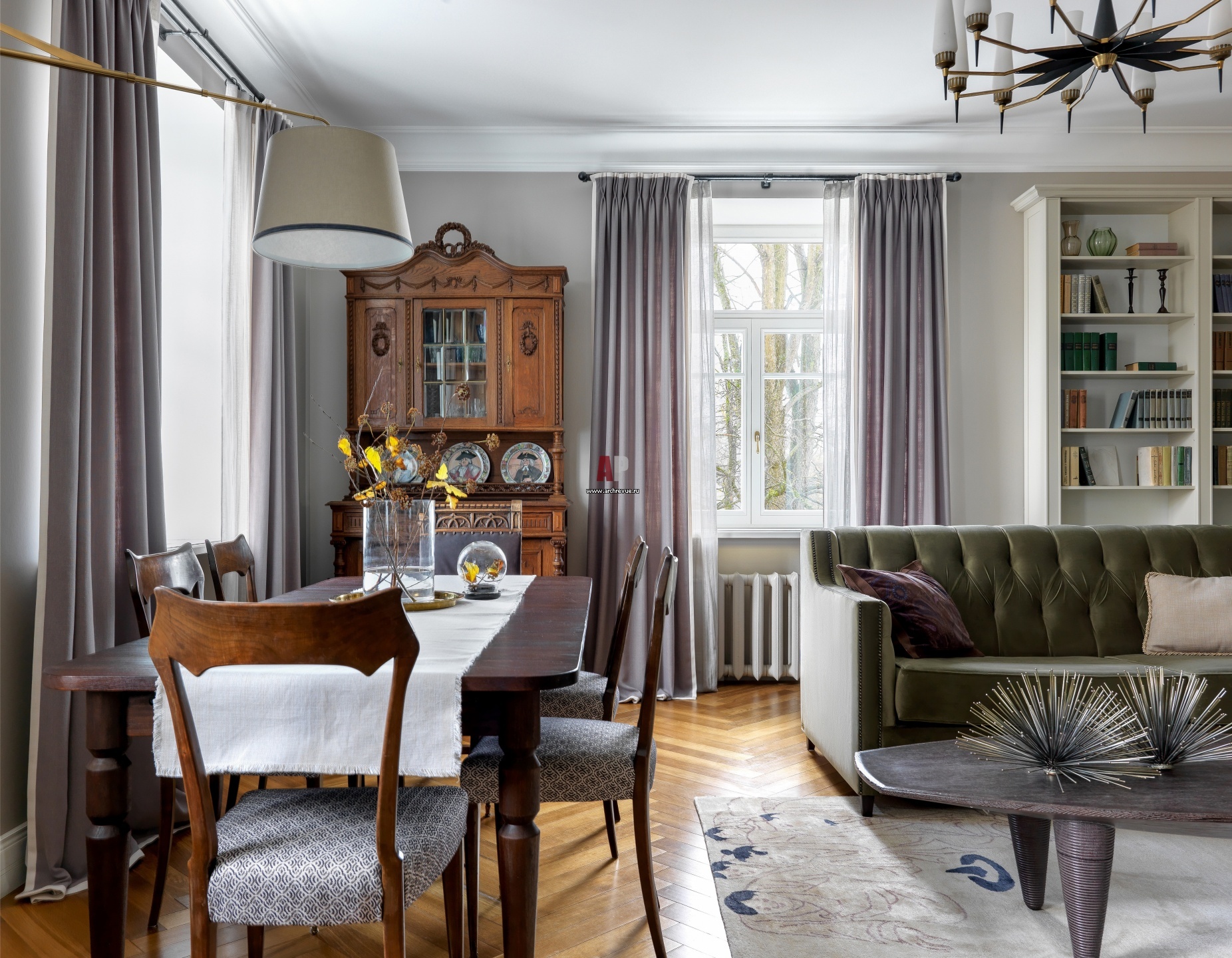 У окон расположена столовая группа. Обеденный стол, Crate and Barrel. Стулья, винтажные. Резной дубовый буфет, винтаж. Телескопический светильник, винтаж.