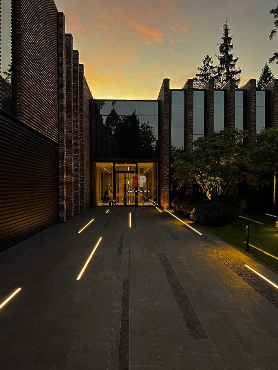 Въездная группа. Вечернее освещение с линейной подсветкой дорожного мощения.