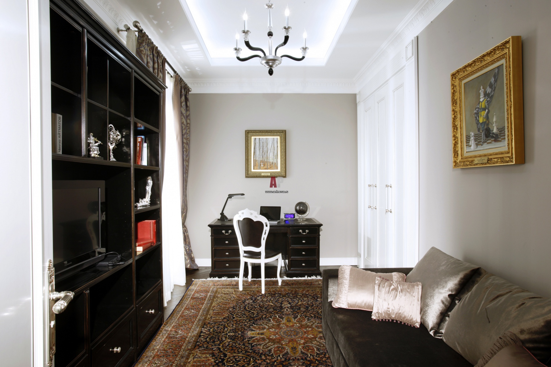 Интерьер кабинеты в стиле старомосковской классики. Стены во всех помещениях квартиры выкрашены в сложный серый оттенок.