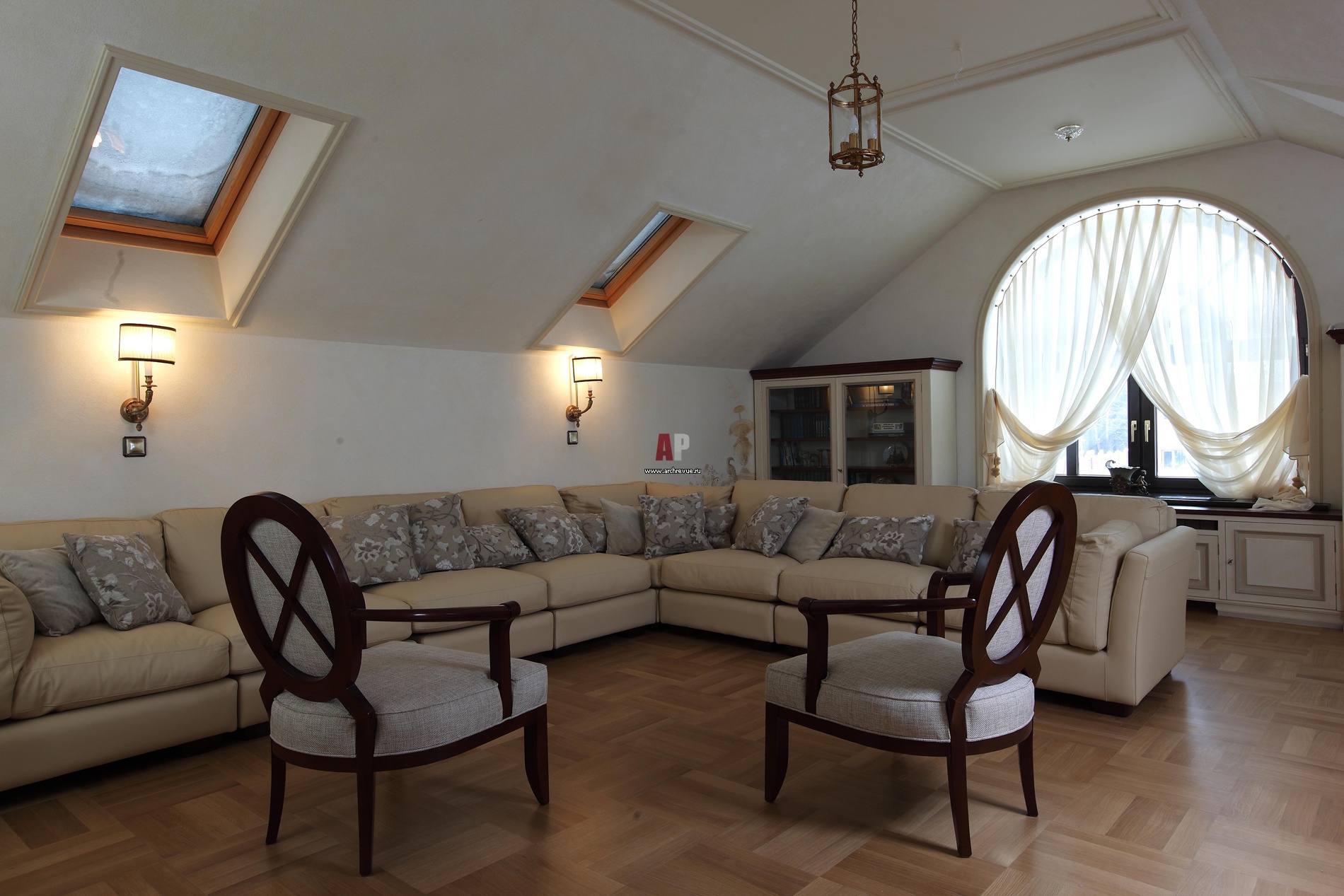 Зона отдыха с домашним кинотеатром находится в мансардном этаже. Она меблирована длинным «г»-образным диваном, сделанным на заказ. На стенах – декоративные штукатурки с деликатной росписью.