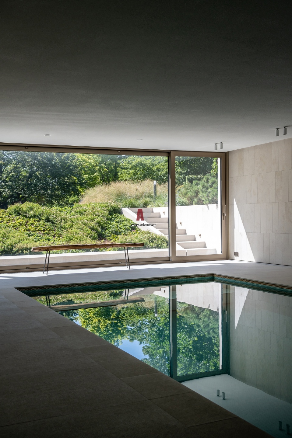 Модернистская дача в Подмосковье. Бассейн с панорамным окном и видом на ландшафт.