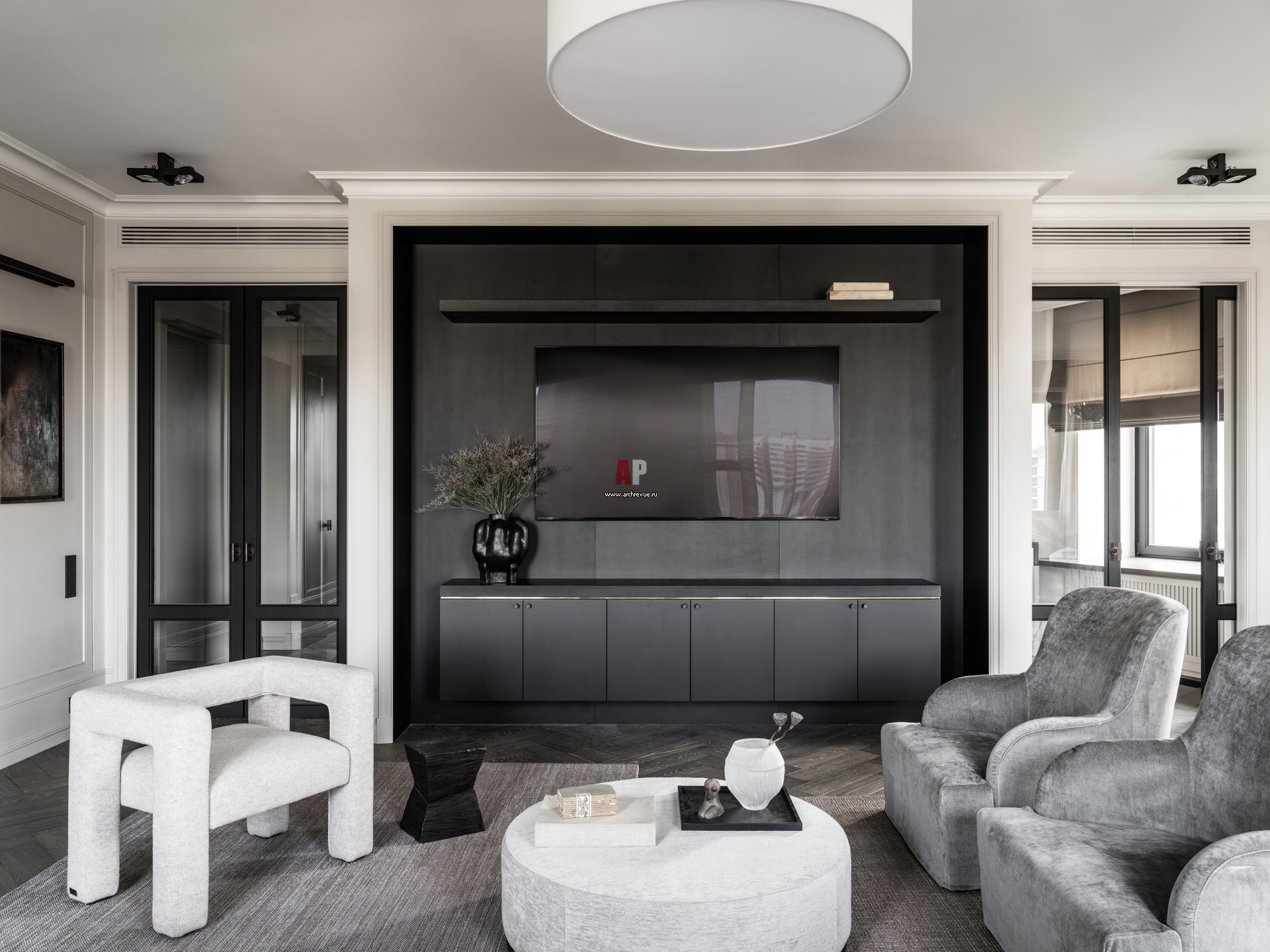 Зона ТВ в гостиной. Чтобы сместить акцент с ТВ-экраны, дизайнеры «растворили» его в нише, облицованной темным шпоном. Кресло, Faina Design, модель Toptun.