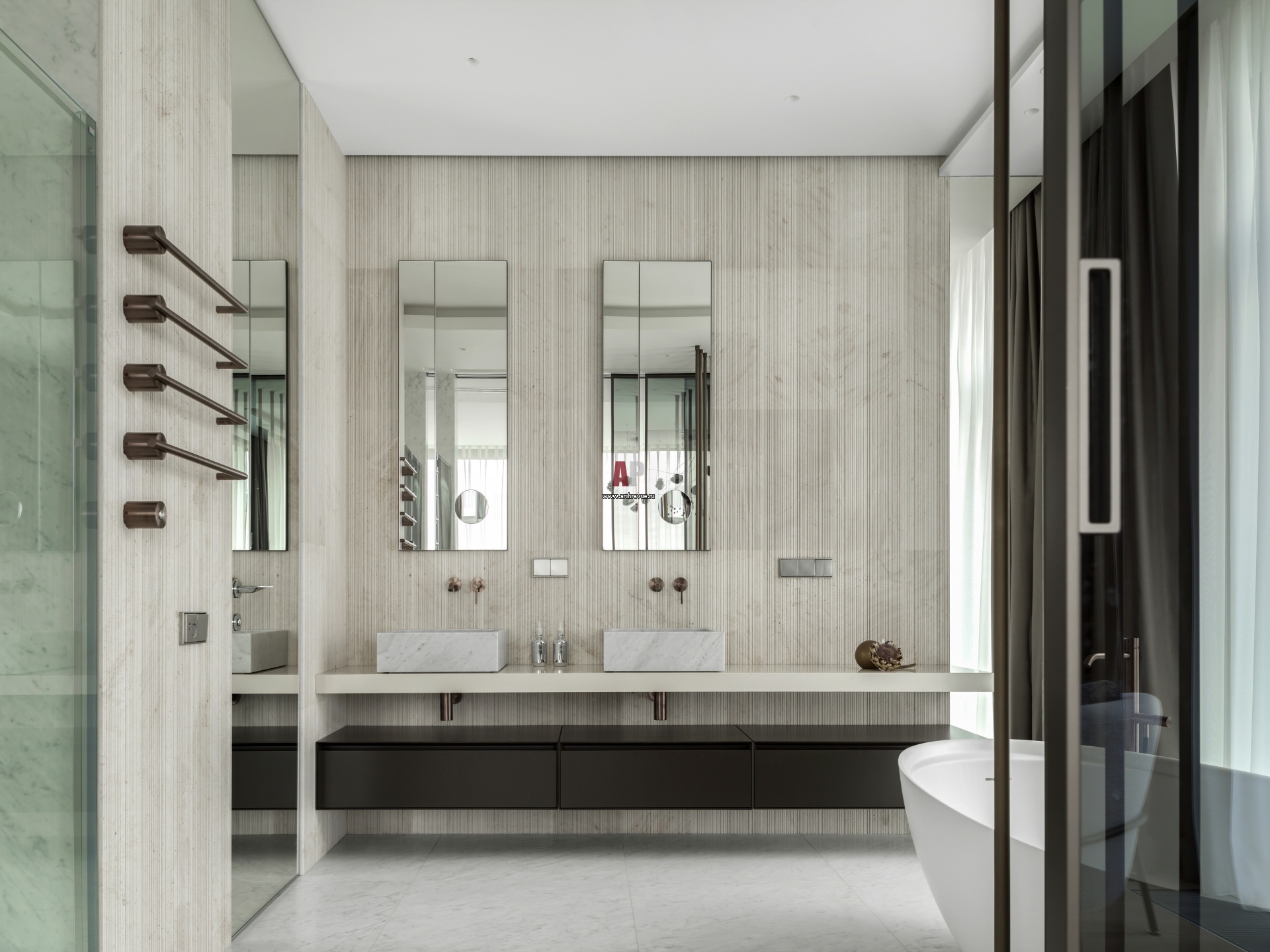 Хозяйская спальня и ванная комната объединены стеклянной раздвижной перегородкой Rimadesio. В оформлении используется натуральный камень, Salvatori. Раковины из натурального мрамора, Antonio Lupi.