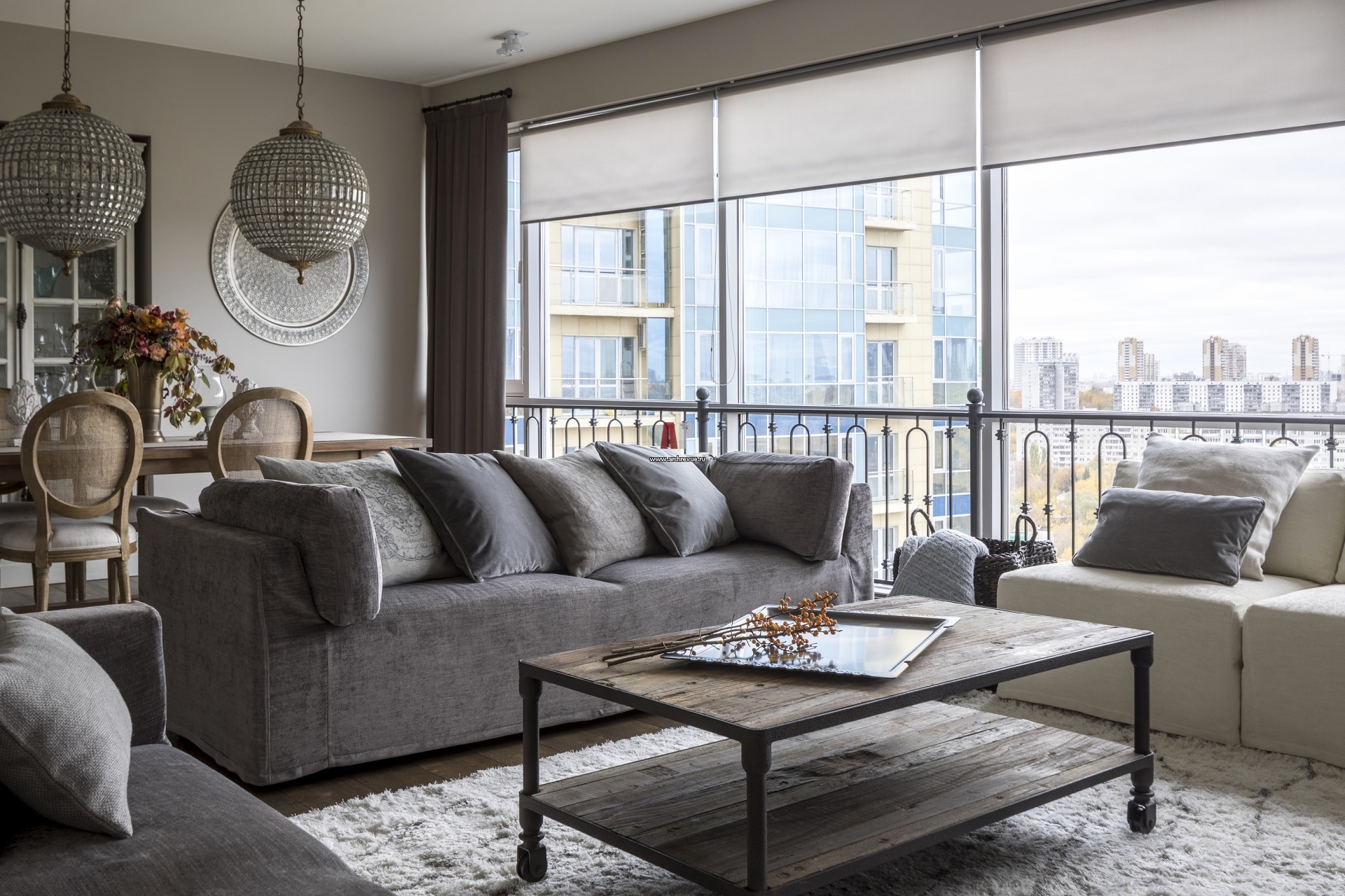 Интерьер гостиной с панорамным остеклением. Диваны и кресла, Busnelli. Декоративные подушки и пледы, Restoration Hardware. Ковер, BoConcept.