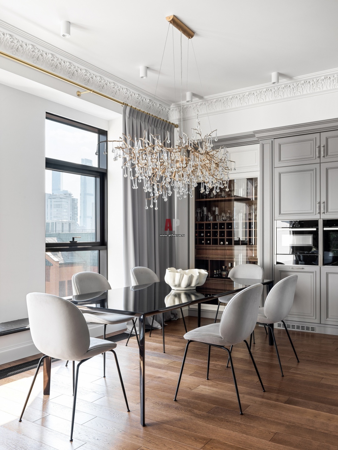 Столовая. Обеденная зона размещена возле окна. Стол, Molteni &C, модель Filigree. Стулья обеденные, Gubi модель Beetle Dining Chair. Люстра, Serip, модель Bijout. Винный шкаф изготовлен на заказ.