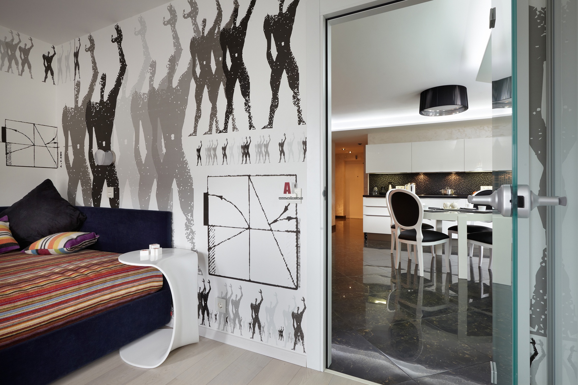 Черно-белый монохромный интерьер детской разбавляет яркий цветной текстиль. Кровать-тахта с ортопедическим матрасом не занимает много места, прикроватный столик выполнен из белого кориана по индивидуальному эскизу.