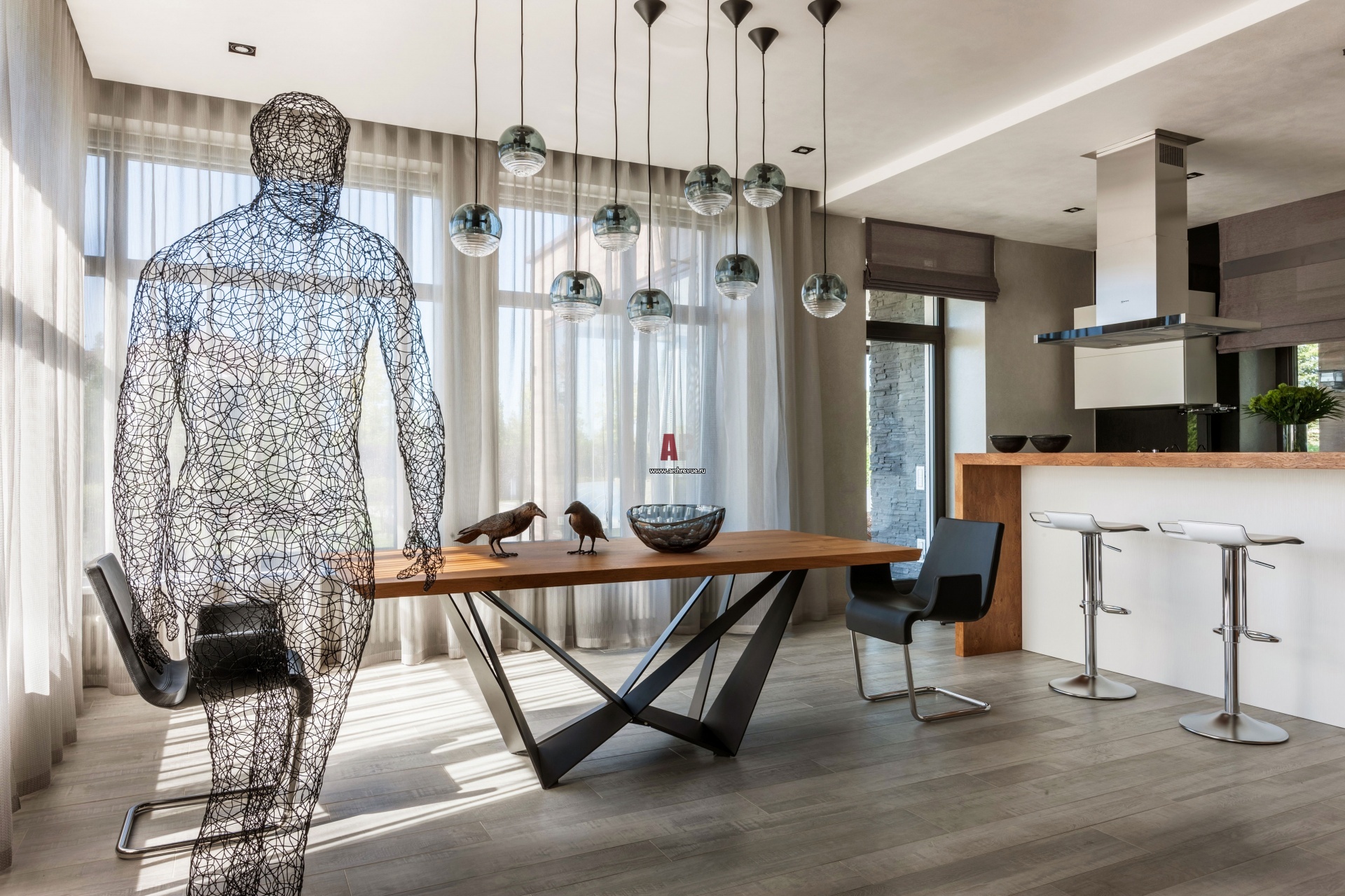 Интерьер кухни-столовой с элементами эко-стиля. Столешница обеденного стола выполнена из необработанной древесины, Cattelan Italia. Стулья, Bonaldo.