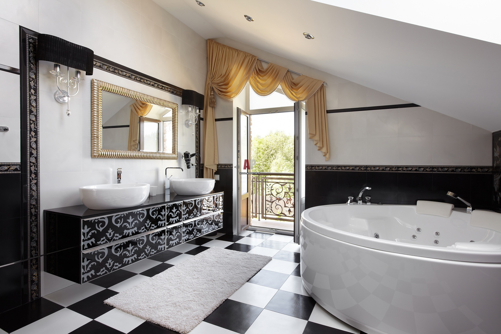 Роскошный интерьер хозяйской ванной комнаты в черно-белой цветовой гамме и деталями гламур. Ванная комната имеет выход на открытый балкон. Стены облицованы керамической плиткой с кристаллами Swarovski от фабрики Gardenia Orchidea. Угловая ванна с гидромассажем. Подстолье умывальника из глянца с дамасским рисунком.